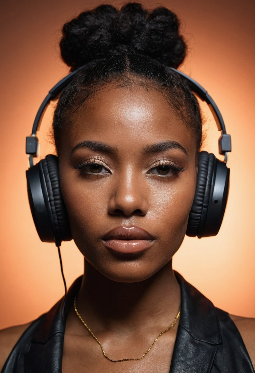 focused Black ebony afropunk woman with glowing LED wireless headphones on, portrait cover DJ magazine , Canon EOS C300 Mark III Digital Cinema Camera, Canon CN-E 20mm T1.5 L F Cinema Prime Lens, f/11, extremely handsome black woman, fashionmodel, extraordinary feminine full face + full lips, very detailed, cinematic, cinematic lighting, ultra detailed, exotic, vivid detail, beautiful soft lighting, life like, photorealism, studio lighting, age 25