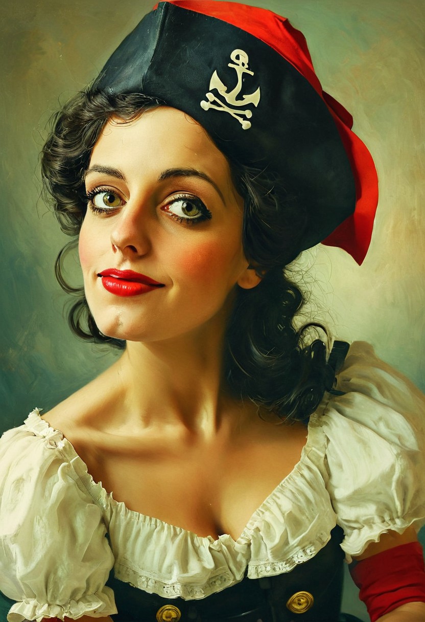 Facial expression style, illustration, ((clever pirate)) (Iranian:1.2) female (cute:1.4), (Gil Elvgren)