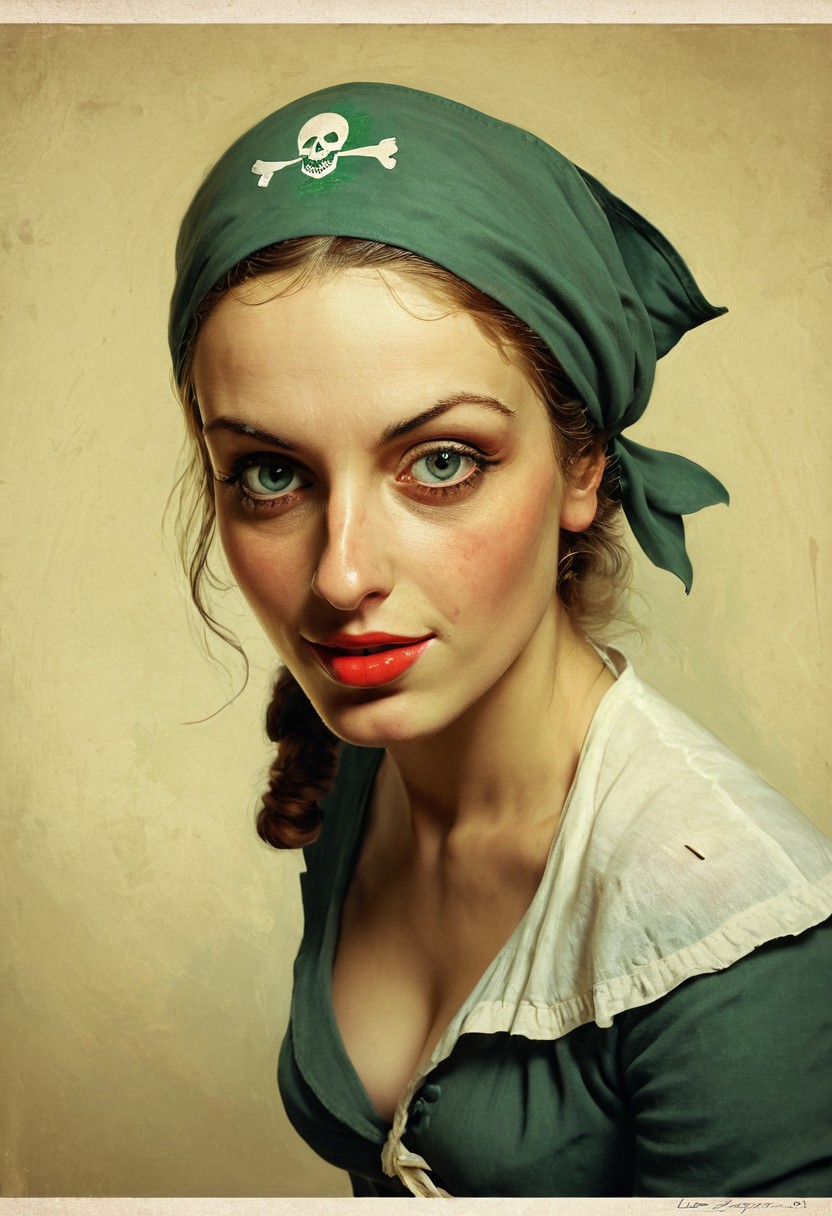 Facial expression style, illustration, ((clever pirate)) (Iranian:1.2) female (cute:1.4), (Gil Elvgren)