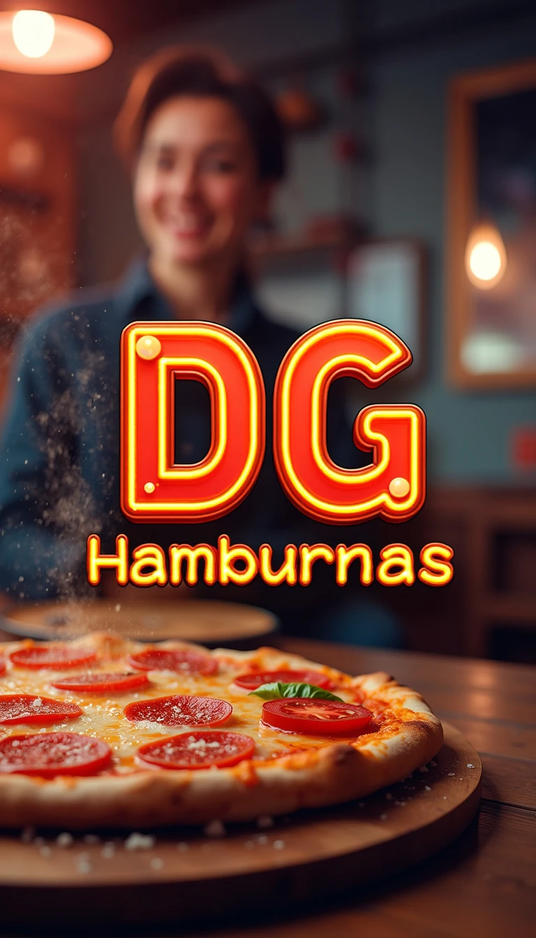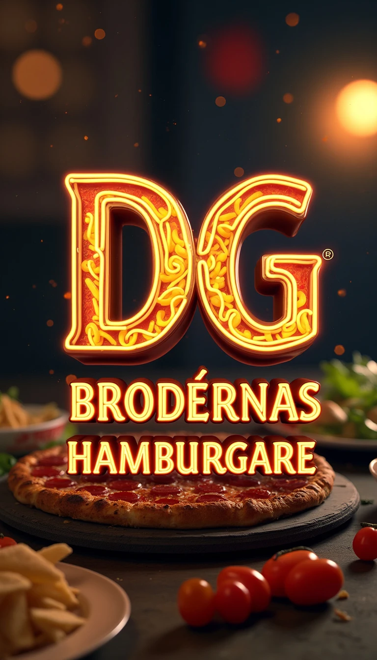 *Prompt:* Crie um logotipo super realista e chamativo para "Brödernas Hamburgare". O foco principal deve ser em elementos detalhados e tridimensionais de pizzas e lanches. As fatias de pizza devem parecer extremamente apetitosas, com queijo puxando, bordas douradas, pepperoni brilhante e vegetais frescos. Hambúrgueres devem ser suculentos, com camadas realistas de carne, alface, tomate e queijo derretido. Inclua detalhes realistas como gotas de molho e vapor saindo dos alimentos, trazendo uma sensação de frescor e sabor irresistível. O nome "DG" deve estar em destaque no centro, com uma fonte forte e moderna em um efeito metálico ou de neon brilhante, para dar um contraste futurista e chamar mais atenção. O fundo deve ser uma imagem rica e detalhada de uma lanchonete vibrante, com luzes de néon suaves, mesas cheias de clientes e pratos de comida. As cores principais devem ser tons de vermelho, amarelo e laranja brilhantes para atrair olhares, enquanto os detalhes em cores mais escuras cri