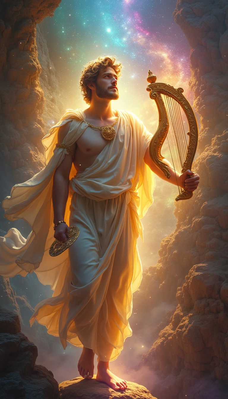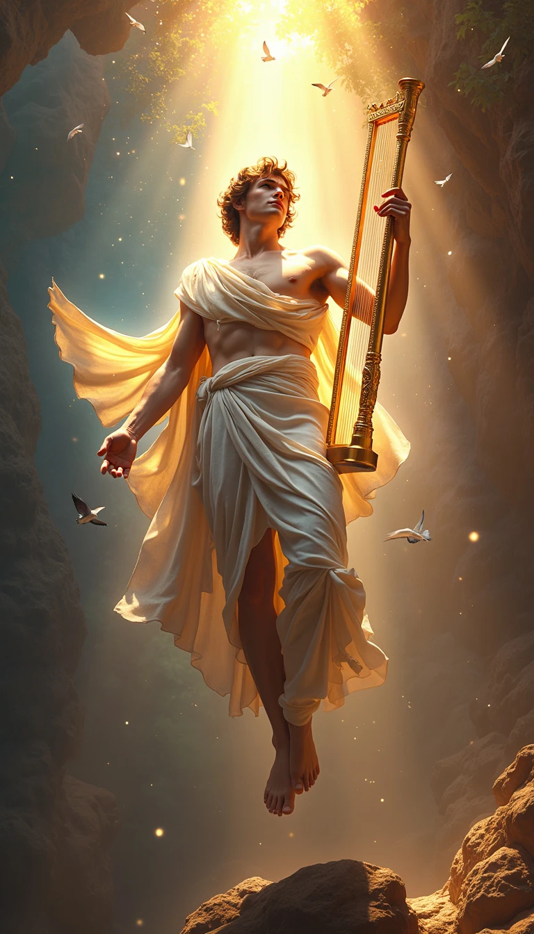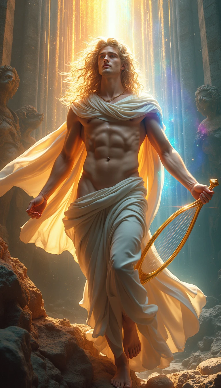 Apollo, God of Light and the Arts: A hyper-realistic digital painting of Apollo, the radiant god of light and the arts, suspended within a dazzling prism of pure sunlight. Each beam of light refracts into a vibrant spectrum of inspirational energy, casting the scene in a halo of creative brilliance. His golden lyre floats before him, its strings vibrating with celestial melodies that ripple visibly through the air in waves of luminous color. The Nine Muses dance in perfect harmony around him, each embodying her art form in fluid, graceful motion, their movements choreographed to the rhythm of divine inspiration. Apollo's face shines with the light of boundless creativity, his eyes shimmering with entire galaxies of untapped potential. The very air around him seems to vibrate with potential, as if reality itself is but a canvas awaiting the stroke of his divine inspiration. Orbiting around him are not just ancient scrolls and painter's palettes, but three-dimensional manifestations of artistic expression through the ages—from the primitive strokes of ancient cave paintings to the cutting-edge forms of futuristic holographic designs. In the background, the Oracle of Delphi shimmers ethereally, her prophetic words spiraling into existence as strands of light. Apollo's robes are a living, breathing canvas, shifting fluidly between every known color and hues that defy mortal comprehension, each fold a testament to the pinnacle of human artistic achievement, constantly evolving in the light of his divine presence.