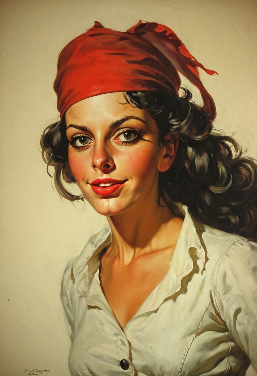 Facial expression style, illustration, ((clever pirate)) (Iranian:1.2) female (cute:1.4), (Gil Elvgren)