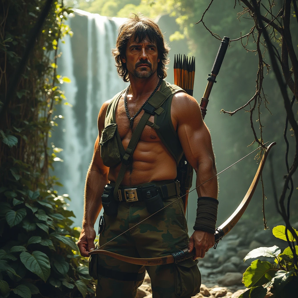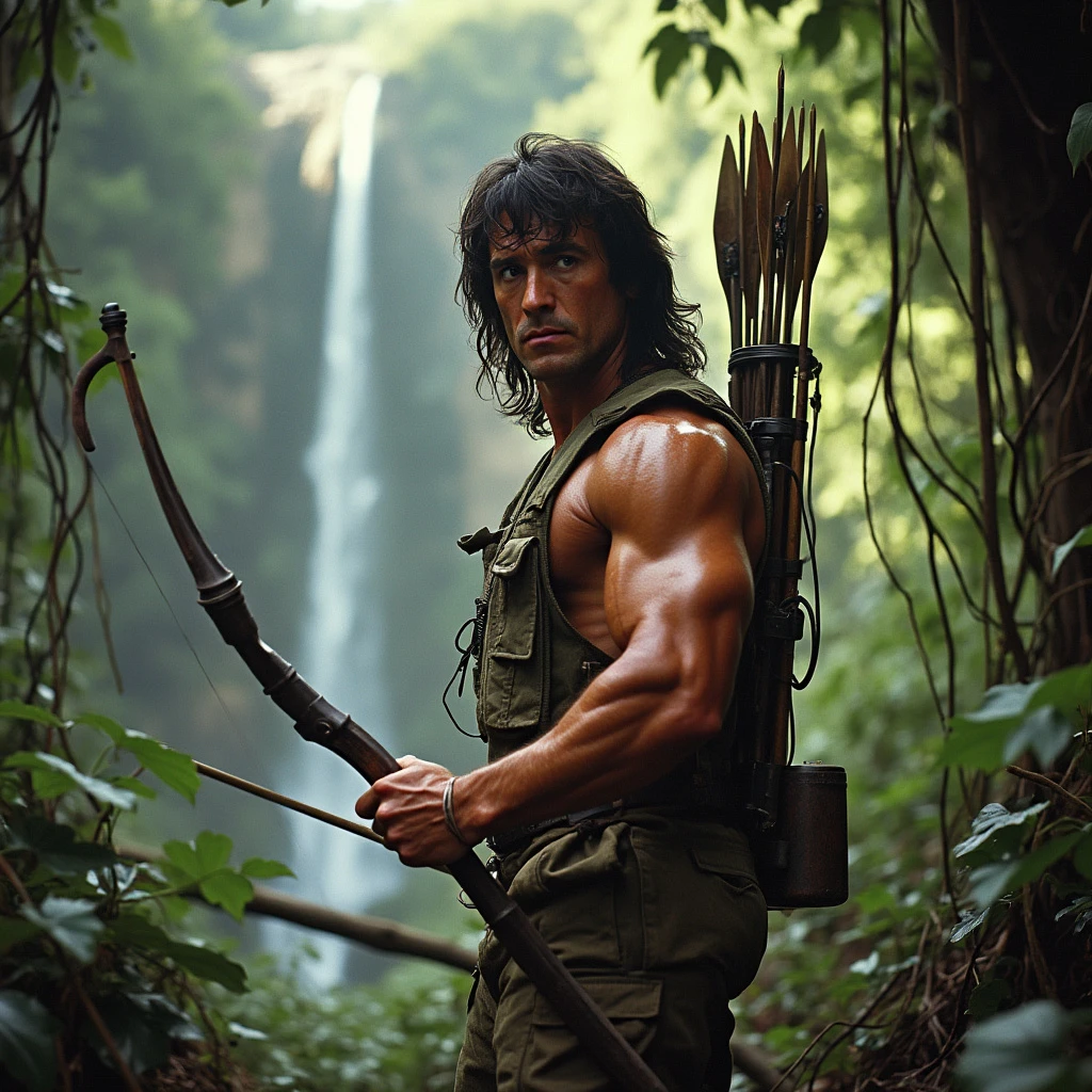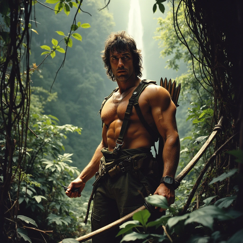 A muscular, grizzled John Rambo (Sylvester Stallone), clad in camouflage fatigues and armed with a bow and arrow, stands amidst a dense, sun-dappled jungle. His face is etched with determination and a hint of weariness. Vines and foliage intertwine around him, creating a sense of isolation and danger. In the background, a distant waterfall cascades down a rocky cliff, adding to the primal atmosphere. Additional details to consider: Lighting: Use dramatic lighting with strong contrasts between light and shadow to emphasize Rambo's silhouette and the intensity of the environment. Mood: Aim for a mood that is both awe-inspiring and ominous, reflecting the beauty and danger of the jungle. Perspective: Experiment with different camera angles to capture Rambo's imposing presence and the vastness of his surroundings. Possible keywords for your image generation tool: Rambo, jungle, survival, bow and arrow, camouflage, muscular, grizzled, determined, weary, vines, foliage, waterfall, dramatic lighting, contrast, awe-inspiring, ominous, perspective.