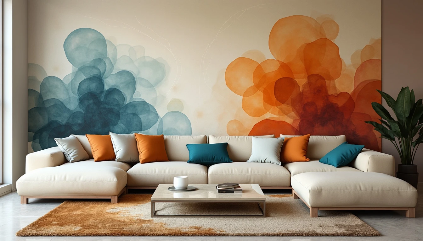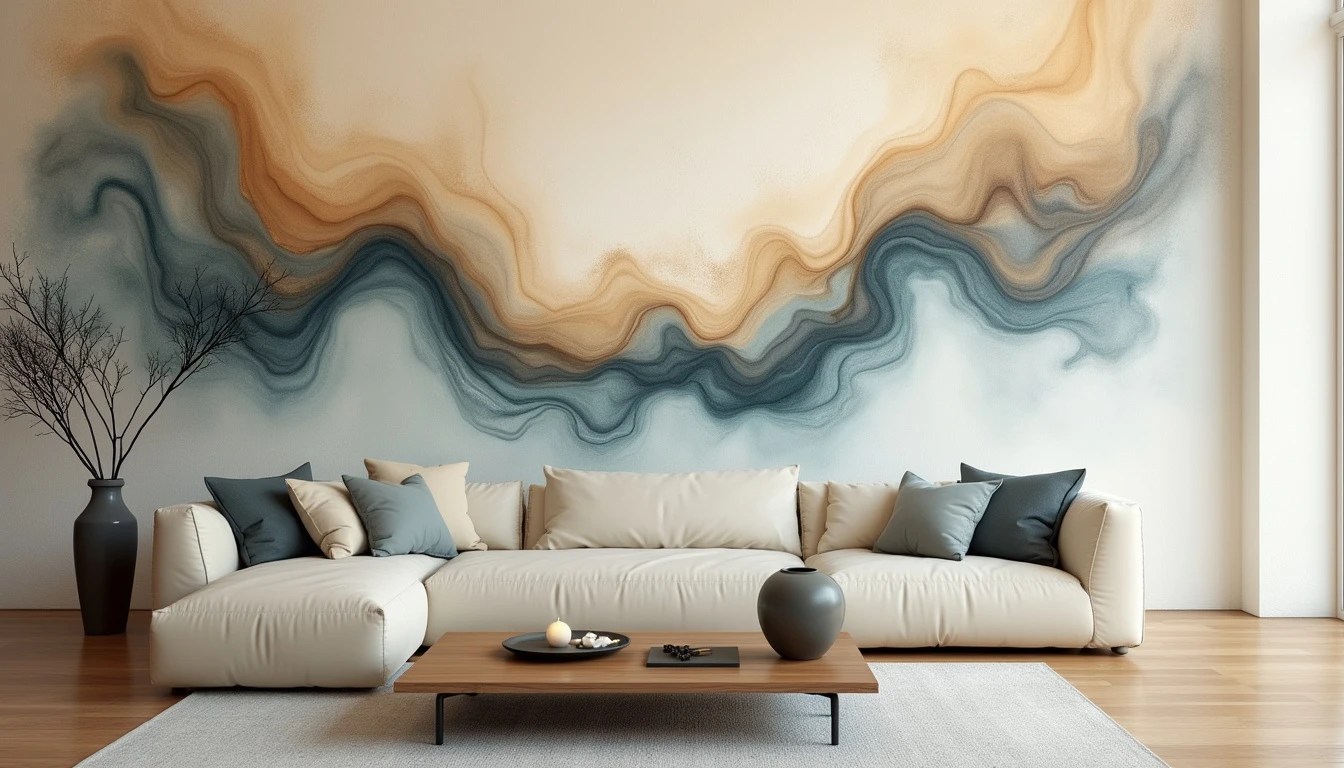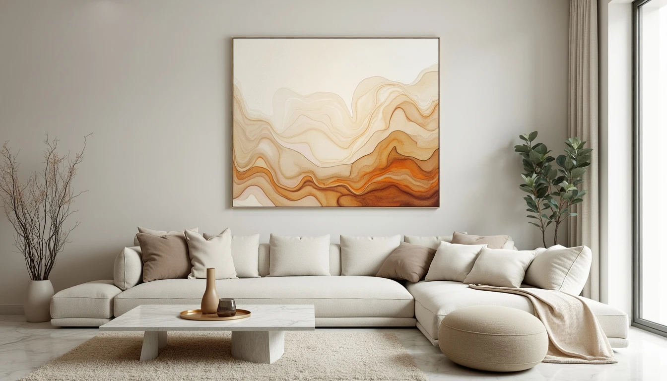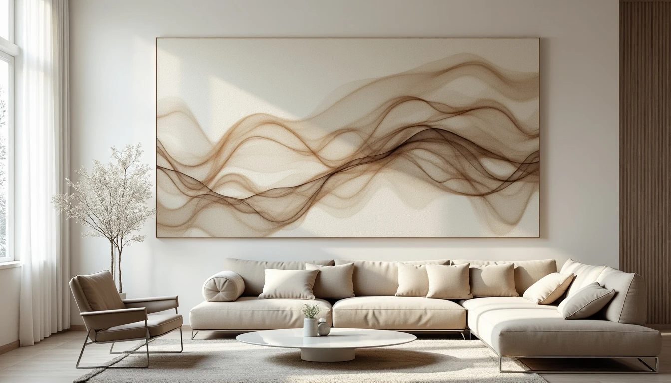 Abstract art piece of a living room : Fluid, amorphous shapes blending into each other. Light colors with occasional bursts of vibrancy. Ethereal, translucent forms suggesting silhouettes without distinct features. Gradual fading from complex patterns to simplicity across the canvas. Zen-inspired minimalism. Negative space increasing towards the edges