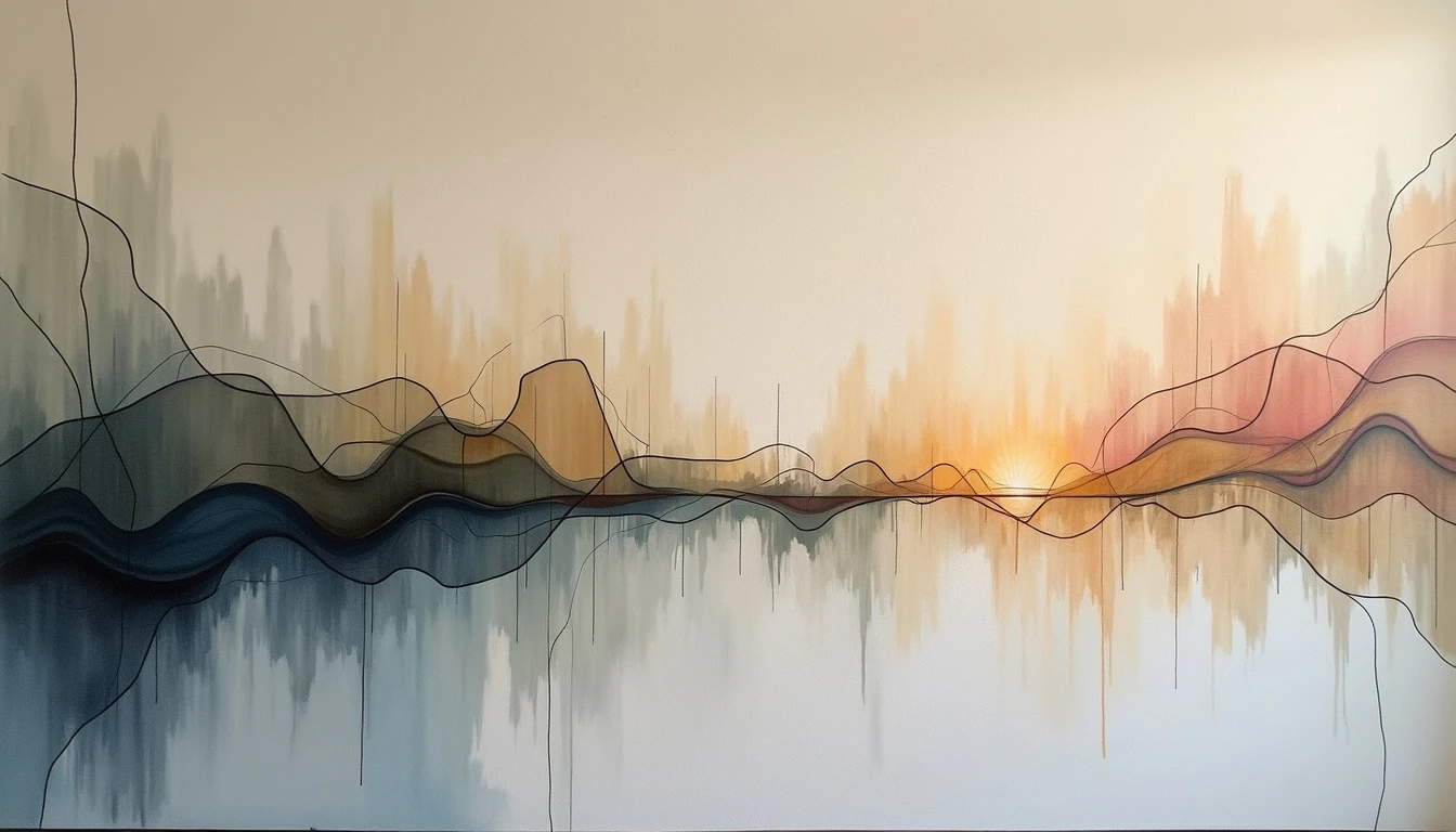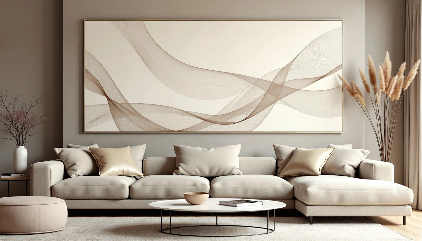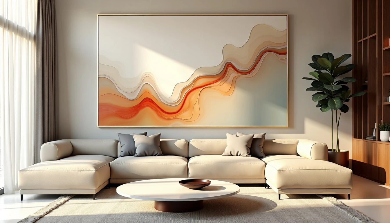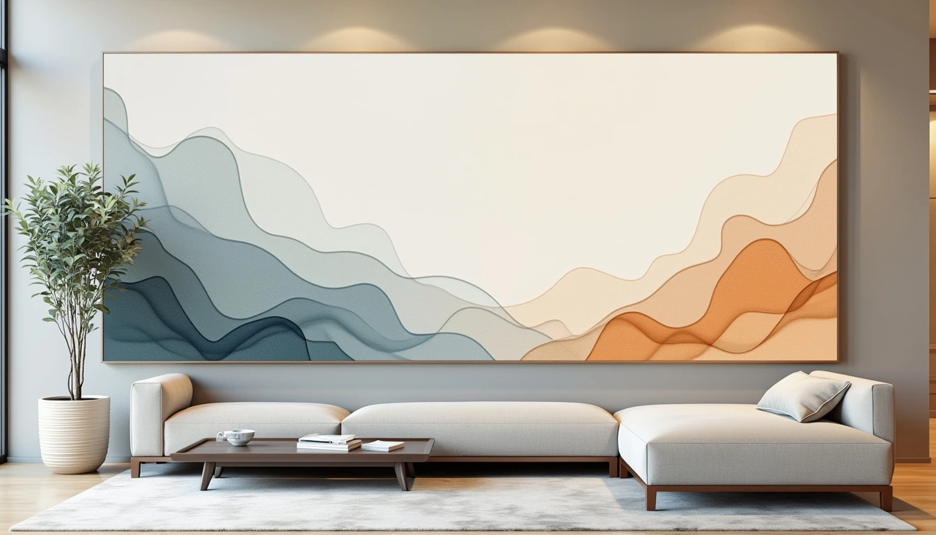 Abstract art piece of a living room : Fluid, amorphous shapes blending into each other. Light colors with occasional bursts of vibrancy. Ethereal, translucent forms suggesting silhouettes without distinct features. Gradual fading from complex patterns to simplicity across the canvas. Zen-inspired minimalism. Negative space increasing towards the edges