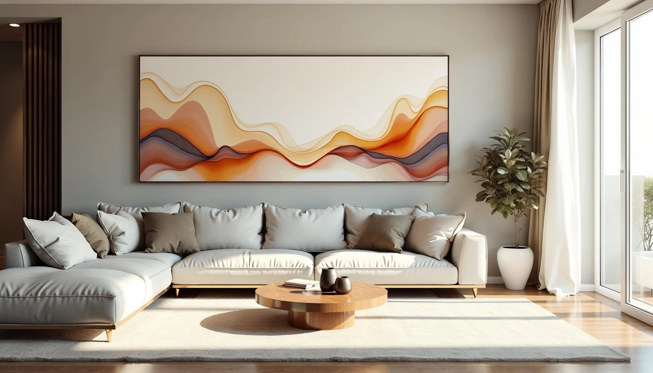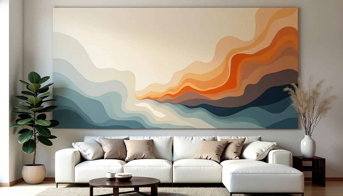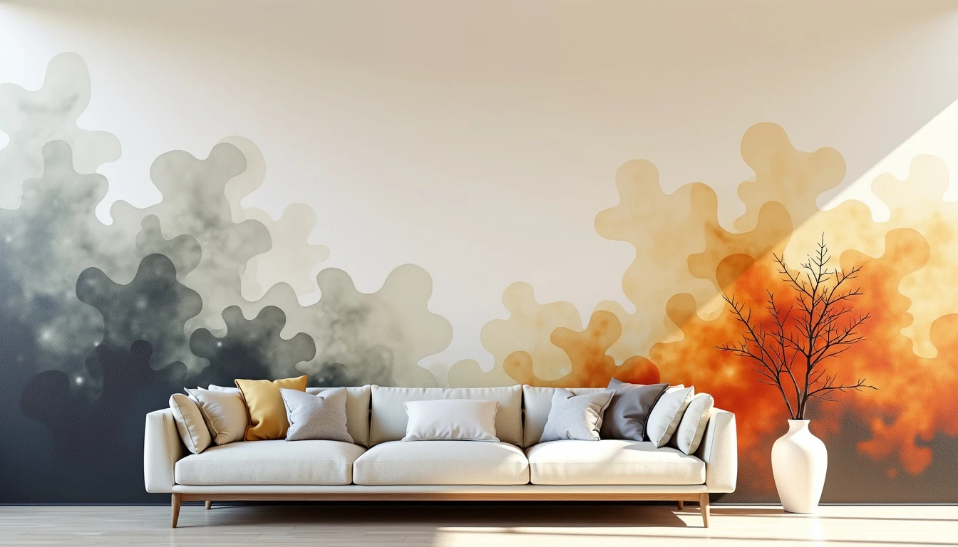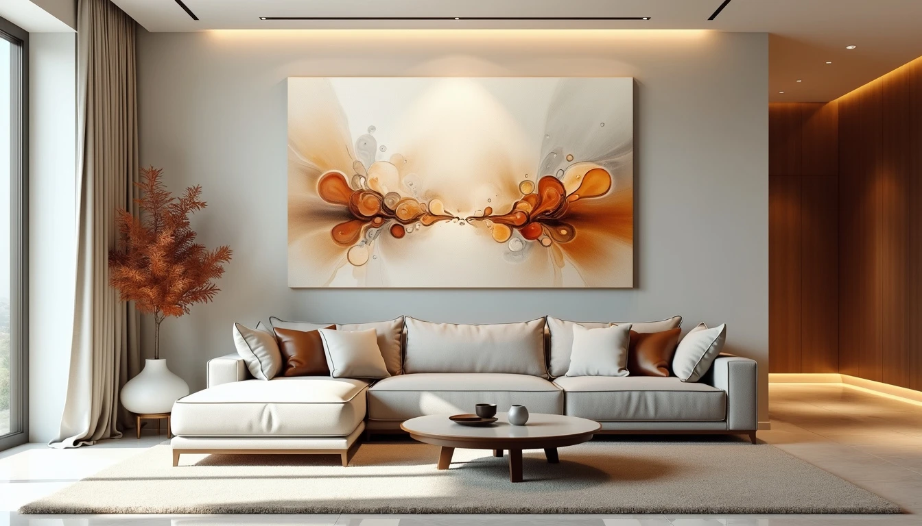 Abstract art piece of a living room : Fluid, amorphous shapes blending into each other. Light colors with occasional bursts of vibrancy. Ethereal, translucent forms suggesting silhouettes without distinct features. Gradual fading from complex patterns to simplicity across the canvas. Zen-inspired minimalism. Negative space increasing towards the edges