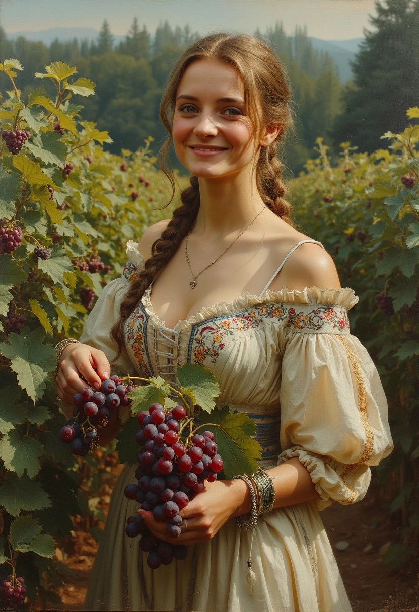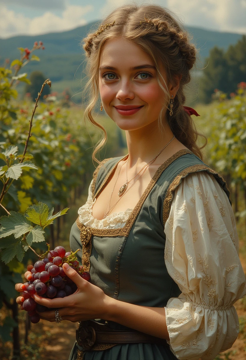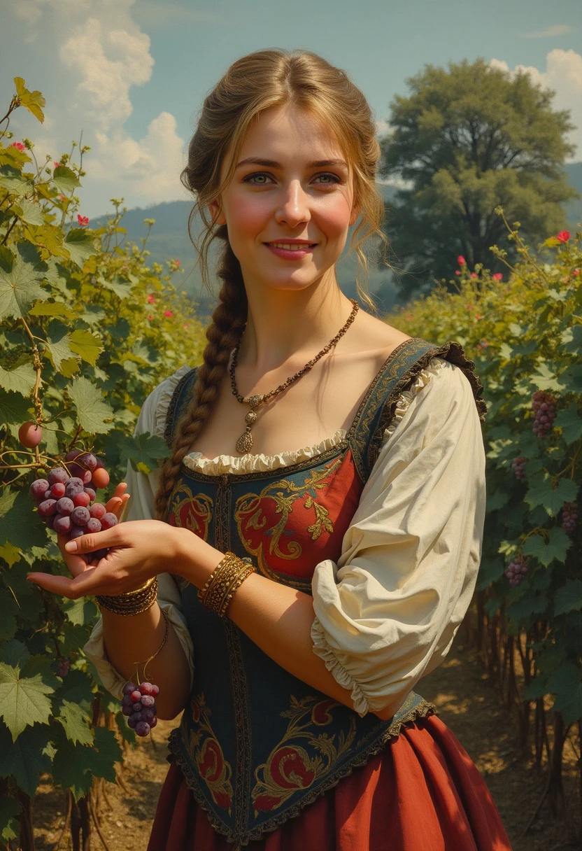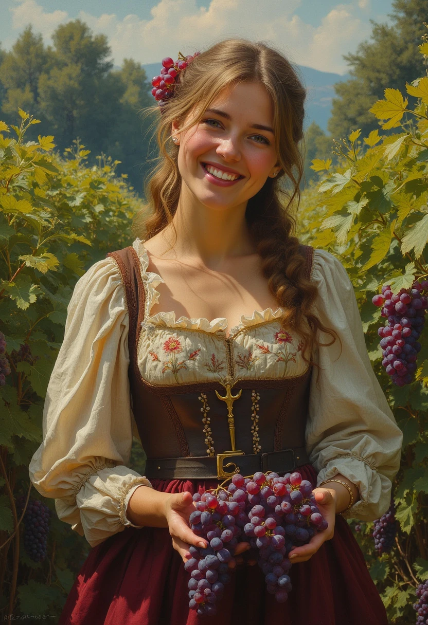 Young Joan of Arc circa 1400, embroidered dress, harvesting grapes, flowering field, trees in background, facial features in focus, large eyes, full body visibility, smiling expression, ultra high definition 16K oil painting, inspired by Alan Paterson, artistic styles of Luis Royo and Pino Daeni, with a touch of Wadim Kashin's technique, soft and contrasting lighting, emotional ambiance, high level of