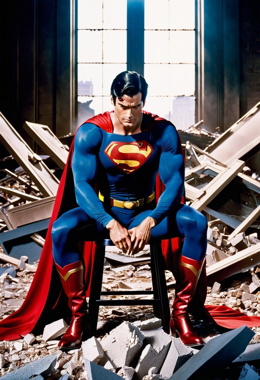 Superman, dressed in his iconic blue and red suit, sits in a worn, metallic chair, his elbows on his knees, hands clasped together, and his head tilted downward in a look of utter despair. A determined Lois Lane stands before him, dressed in a crisp, professional attire, her eyes locked intensely on the photograph, her hand extended, and her long pointer directed at a specific point on the image. The photograph, a grainy, high-contrast depiction of a collapsed building, dominates the whiteboard behind her, a mess of rubble, shattered glass, and twisted metal. The scene is bathed in warm, golden lighting, with deep shadows and a subtle film grain, evoking the look of a 35mm film still, shot on a v-raptor XL camera, with a slight vignette and masterful color grading, post-processed to perfection, reflecting the cinematic flair of legendary superman era of the 50's