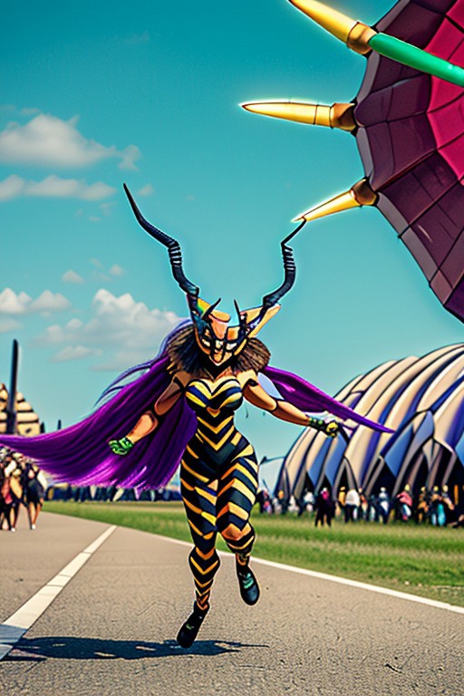 raw photo,cinematic shot, masterpiece,best quality,queenbeemon,1girl,solo,purple hair,braided ponytail,green eyes,hair ornament,mask,antenna,horns,full body,cape,running,park
