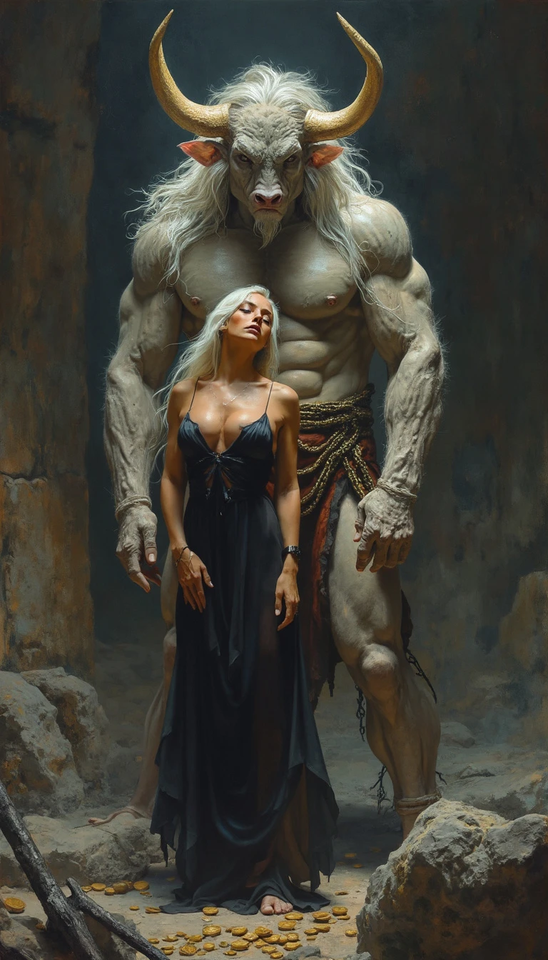 Task: Hyperrealistic oil painting Style: 1970s fantasy book cover art, inspired by mythological themes, Realism, Neo-Classicism, Academic art Composition: Full body, from head to toes, low angle view Setting: Minotaur's lair, a shadowy, torch-lit cavern with ancient stone walls and scattered gold coins Subject details: Muscular physiques, pale skins, smooth, with a polished, marble-like appearance, Muscular physiques, pale skins, smooth, with a cold, almost marble-like texture Subject 1: A mature woman with long, flowing white hair, her lips painted jet black, wearing a flowing, sheer dark gown made of chains that clings to her curves but still reveals glimpses of her pale skin Subject 2: A massive, old but powerful minotaur with a pale , massive body, a fierce bull's head with chipped horns, and a mane of white fur cascading down his neck; his physique is imposing, , his body is muscular, with age adding to his commanding presence. he is platinum white with golden horns. The woman stands looking teasingly at viewer while the minotaur stands tall behind her, his massive biceps flexed above her head as if to shield her, his presence both protective and dominating. The scene exudes a blend of dark romance and raw power, capturing the timeless tension of mythological tales.