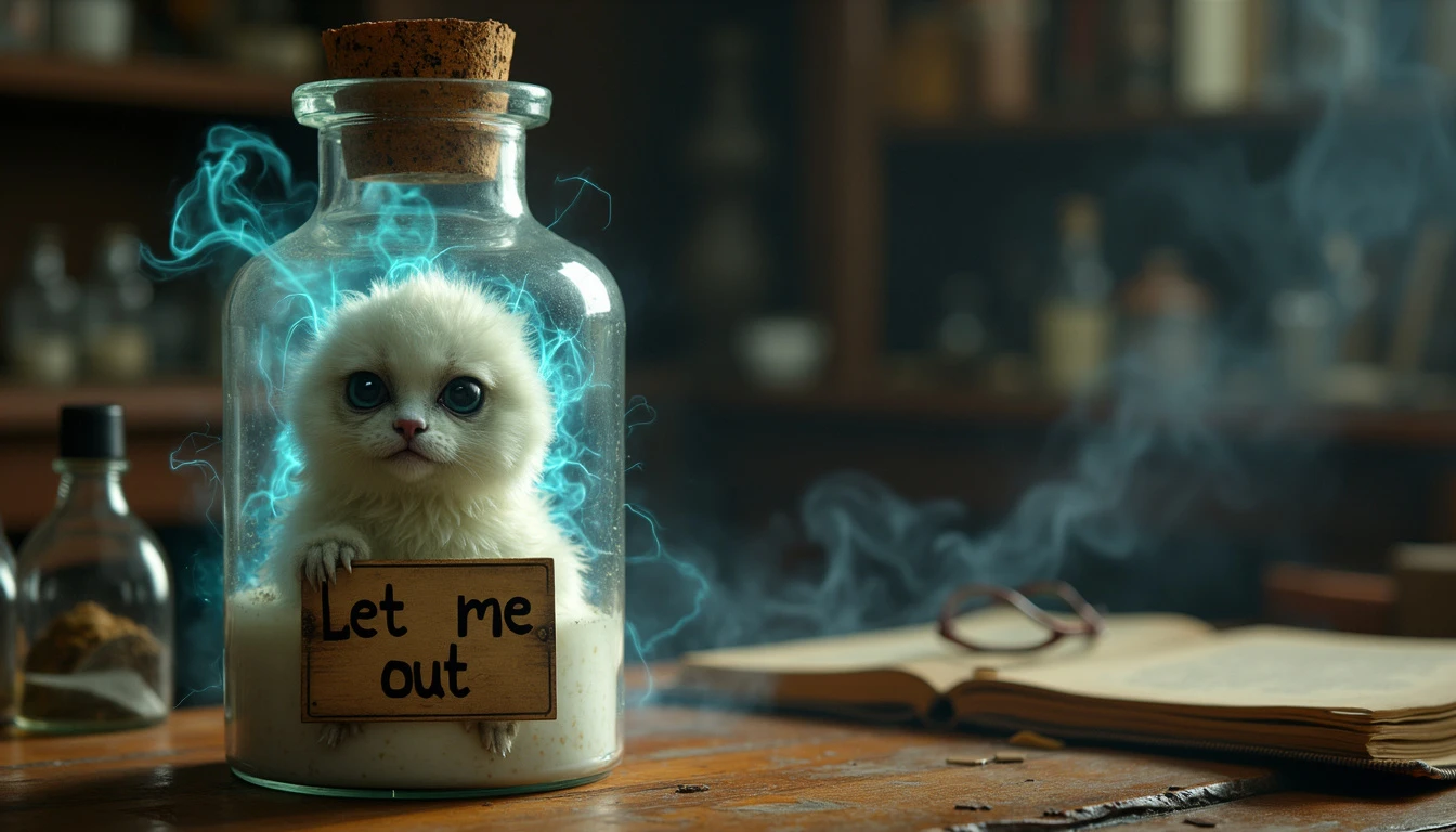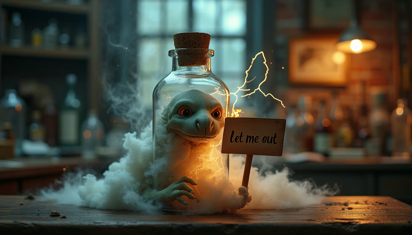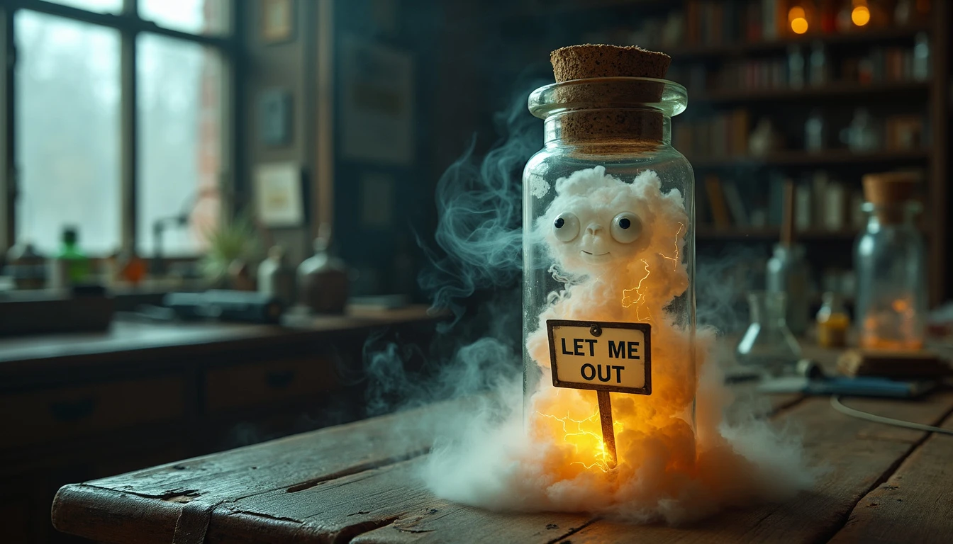 A hyperealistic specimen bottle with cork stopper. Inside the bottle is a skin formed from thick clouds of swirling smoke and lightning, it is looking at the viewer, holding a sign that says "let me out". At the old wooden desk at the laboratory