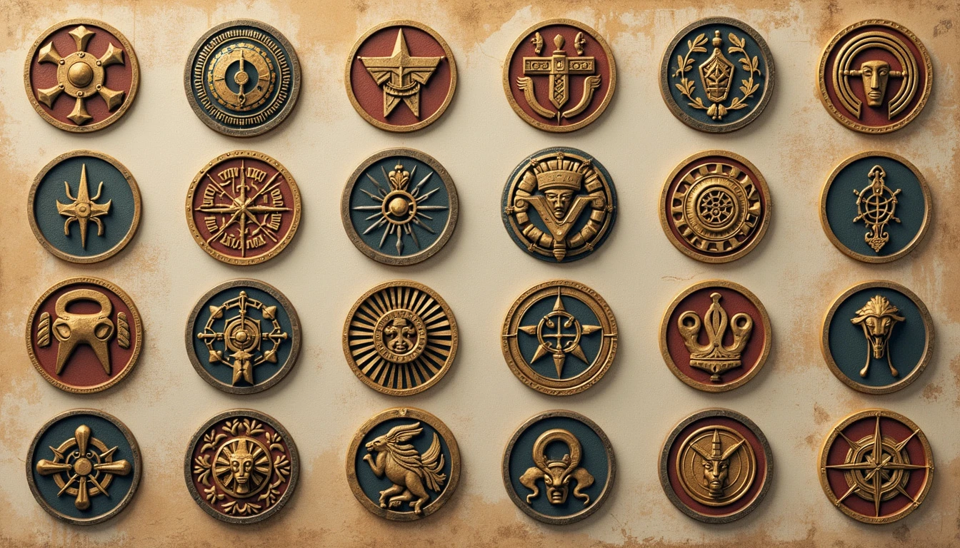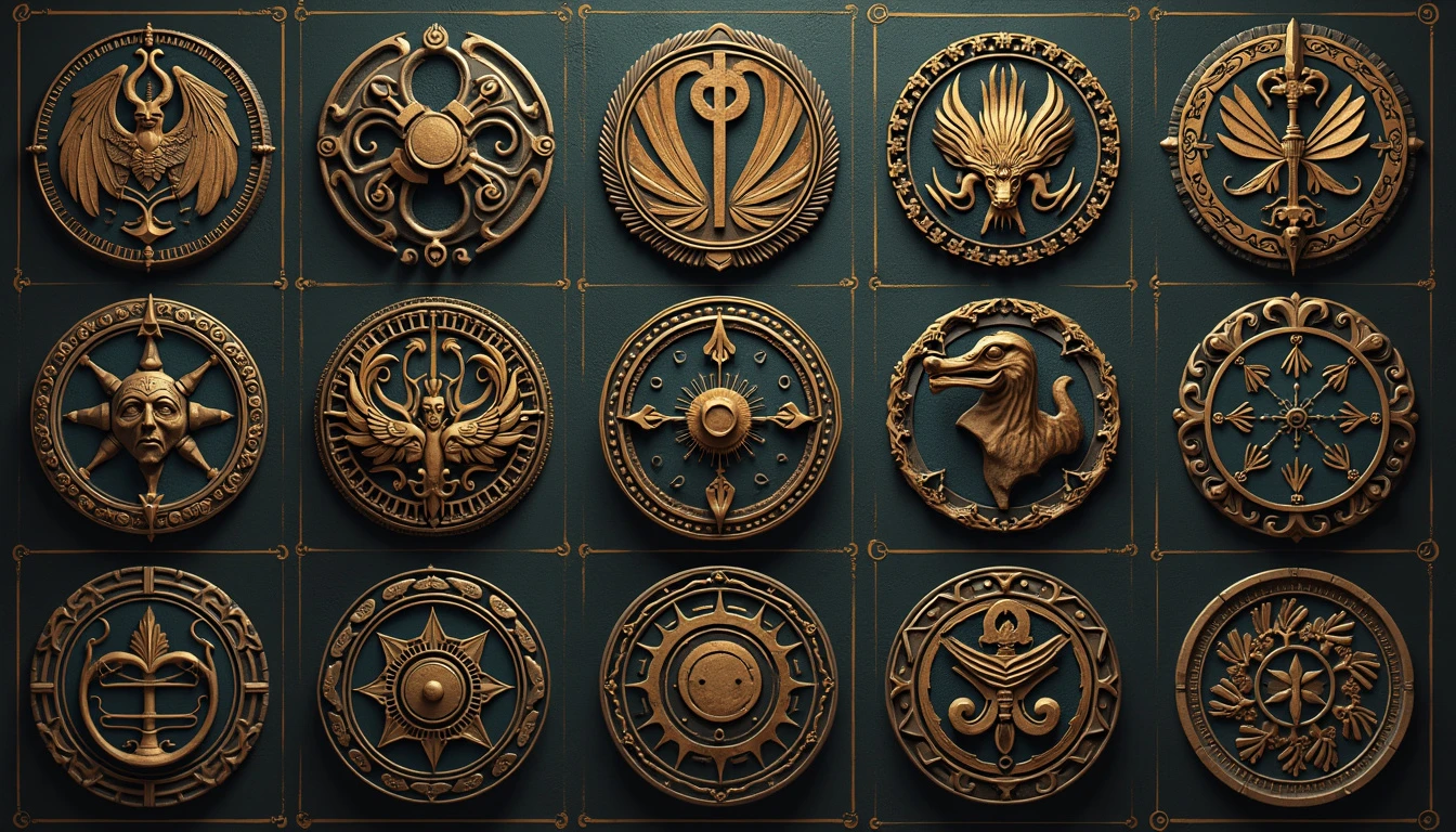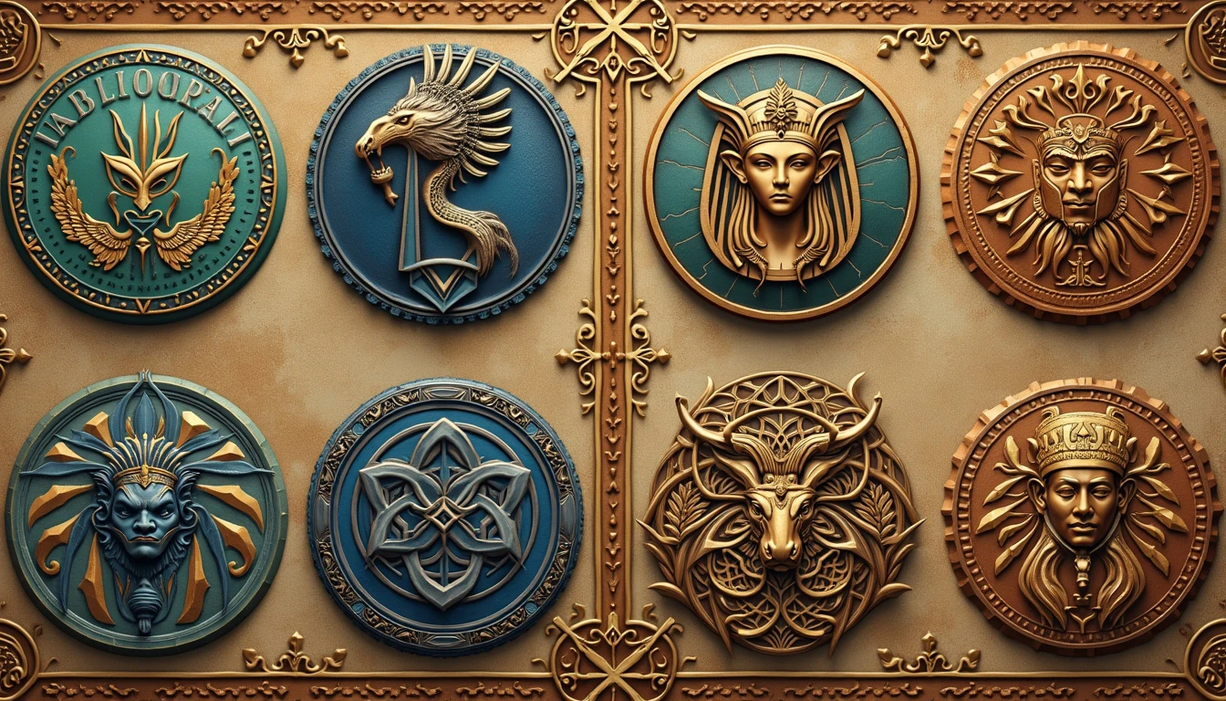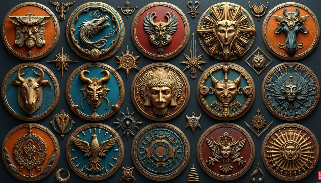 24 circular places for placing logos, design about mythology, high details, high resolution, greek, norsk, egyptian, aztec and japanese mythologies