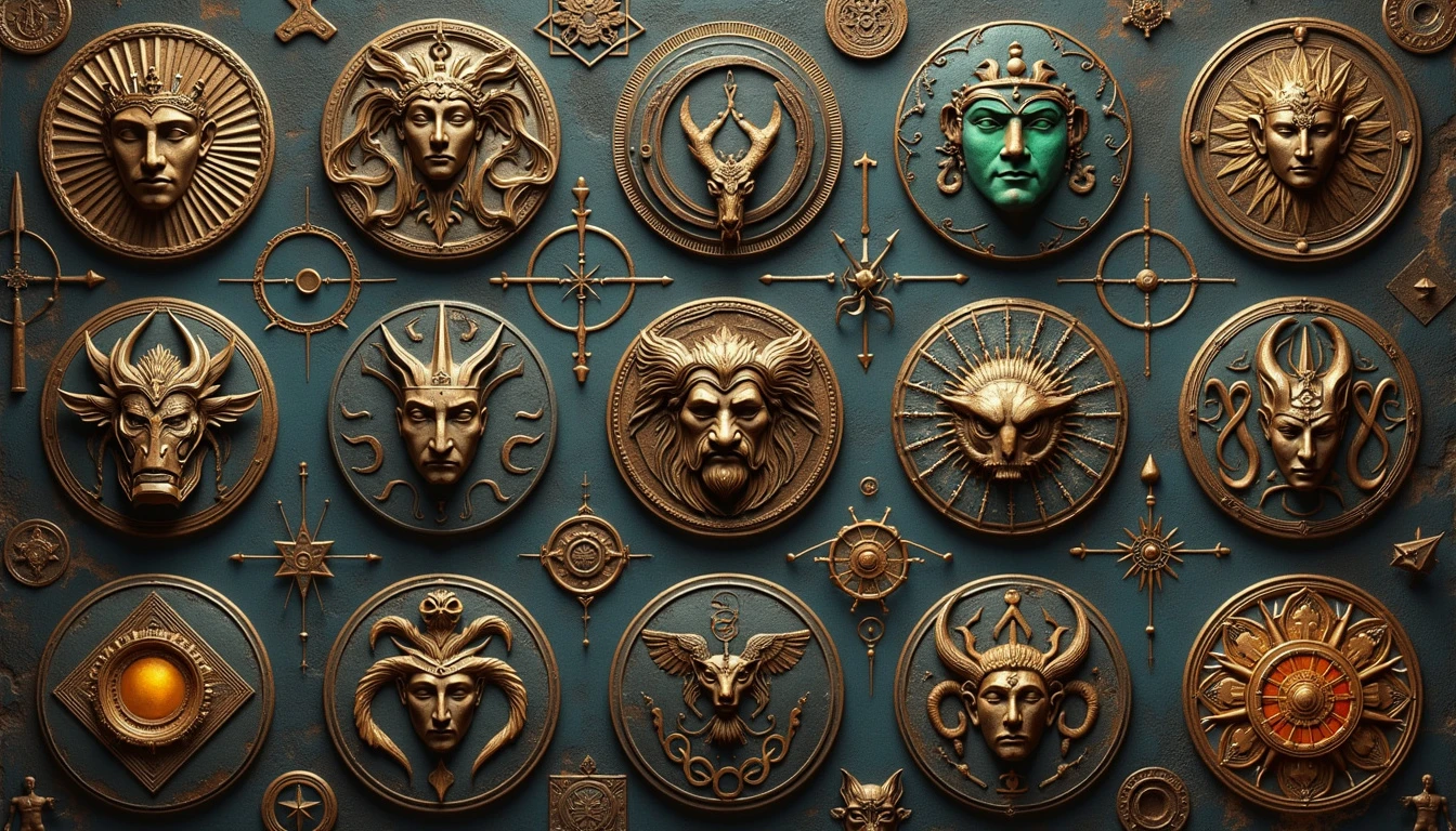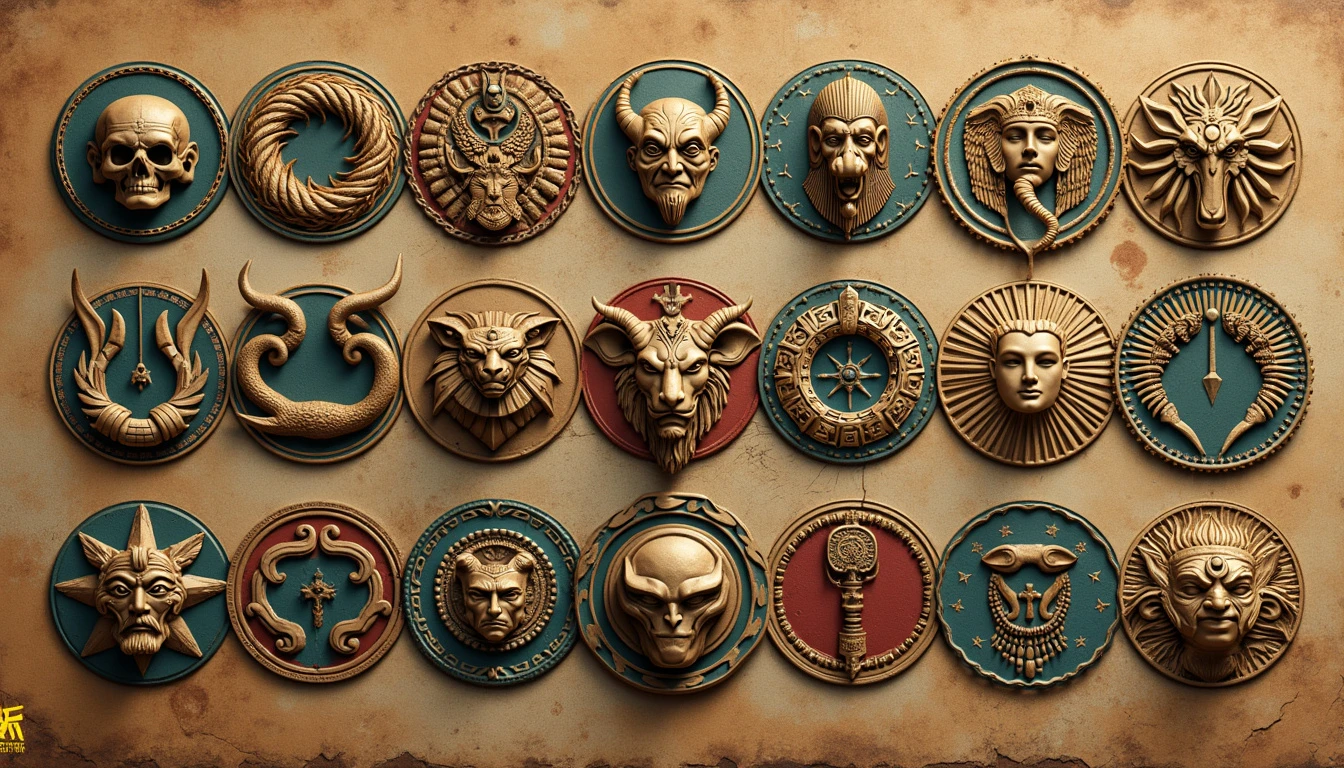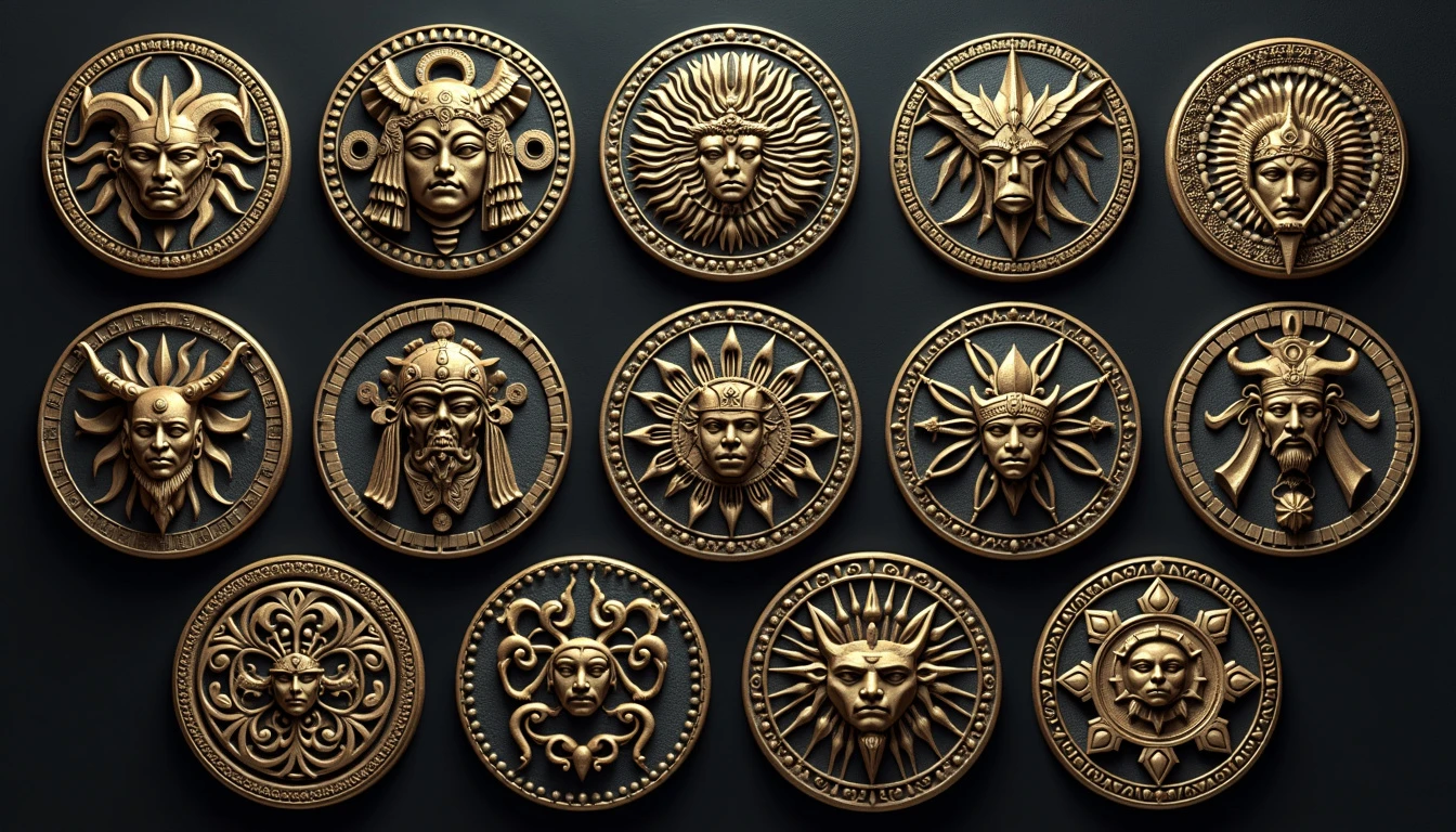 24 circular places for placing logos, design about mythology, high details, high resolution, greek, norsk, egyptian, aztec and japanese mythologies
