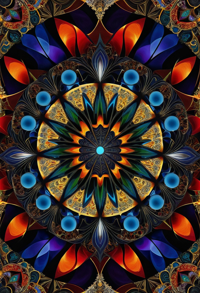 Spider-woman, kaleidoscope, tile, symmetry, fractal, mandala, ABS Fractal, Surrealist, Abstract, Calligraphy, Psychedelic, Fine detail, Oil on canvas, Deep triadic colors, Dark shadows, Black, White, Red, Gold, Silver, Bronze, Orange, Yellow, Green, Blue, Indigo, Violet, Magenta, Cyan, Brass, Chrome, Crystal