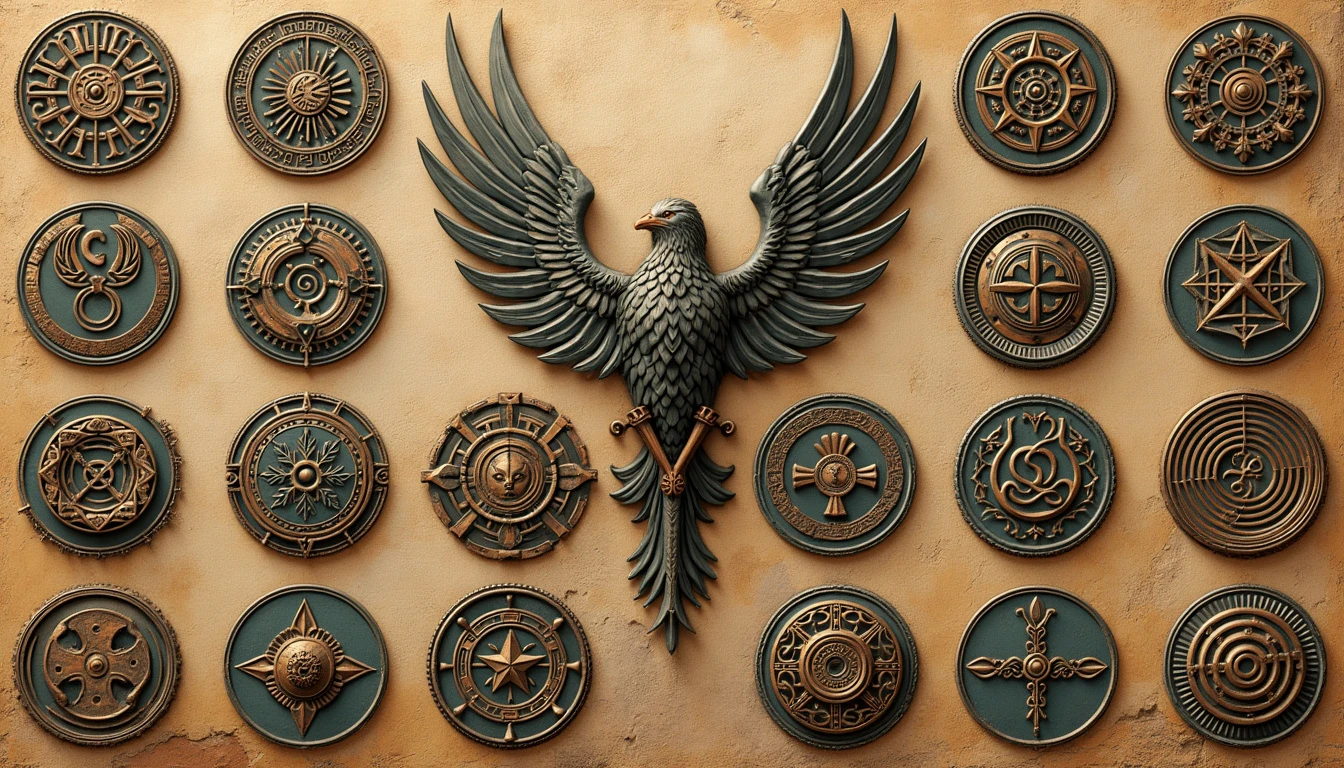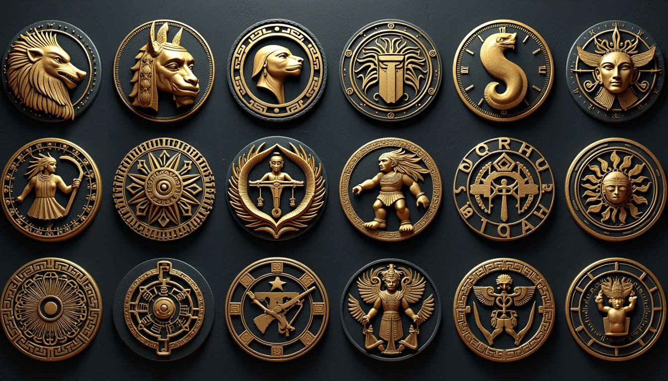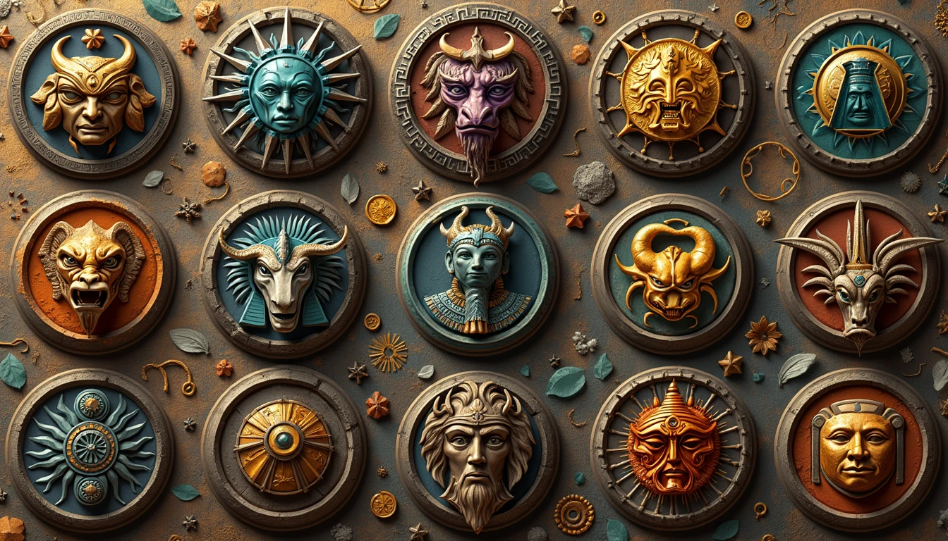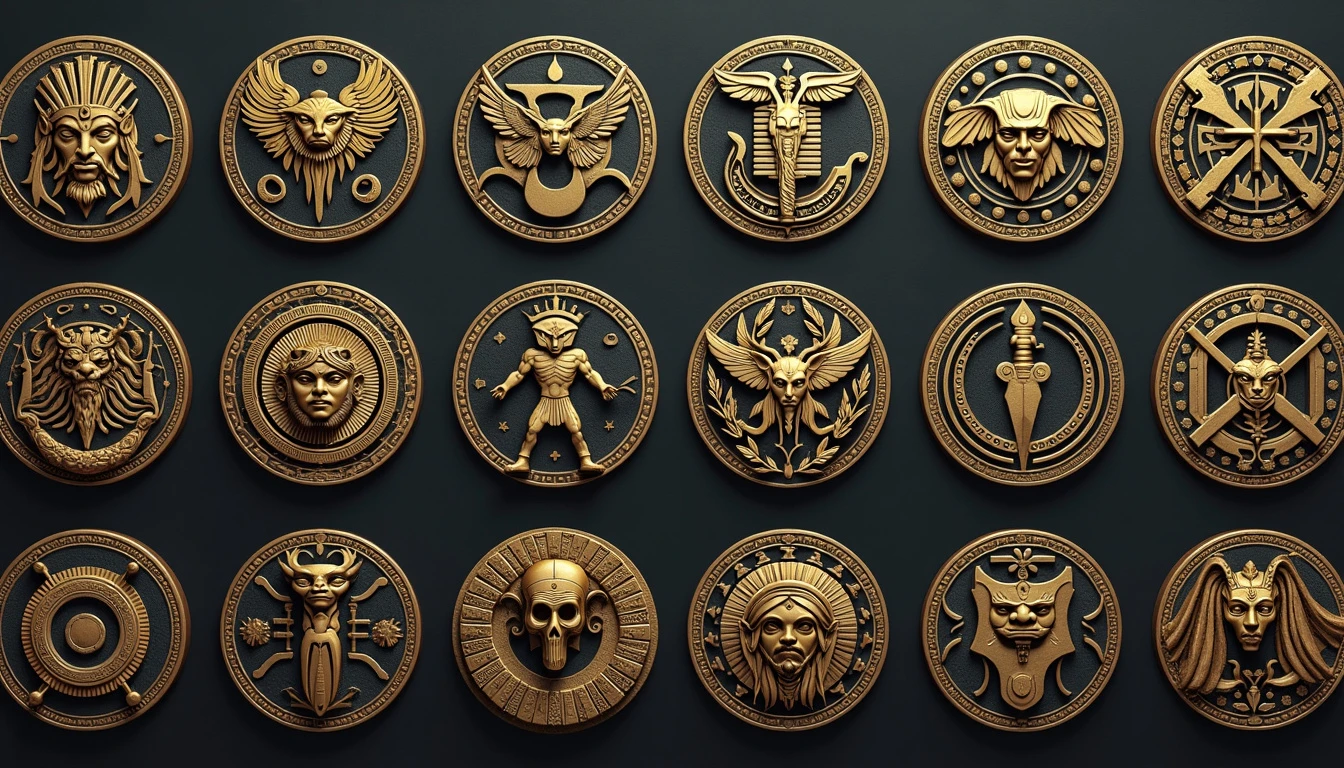 24 circular places for placing logos, design about mythology, high details, high resolution, greek, norsk, egyptian, aztec and japanese mythologies