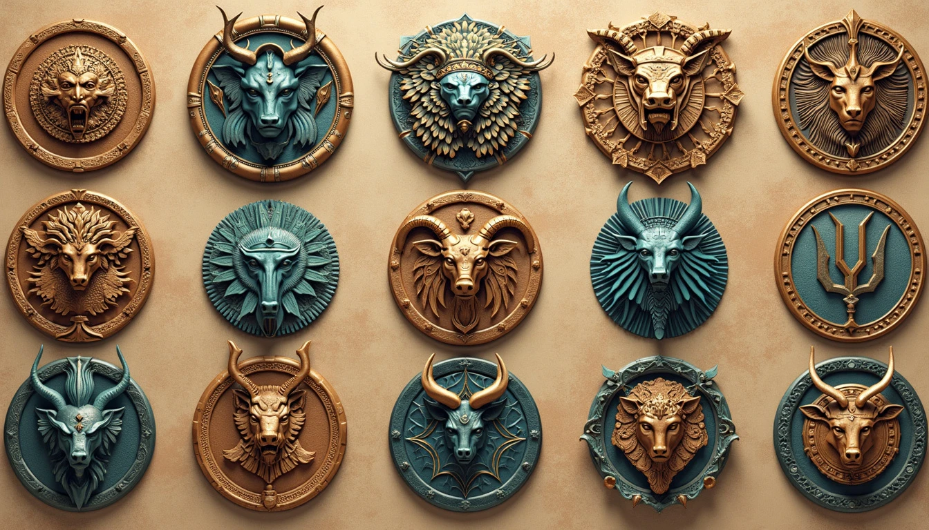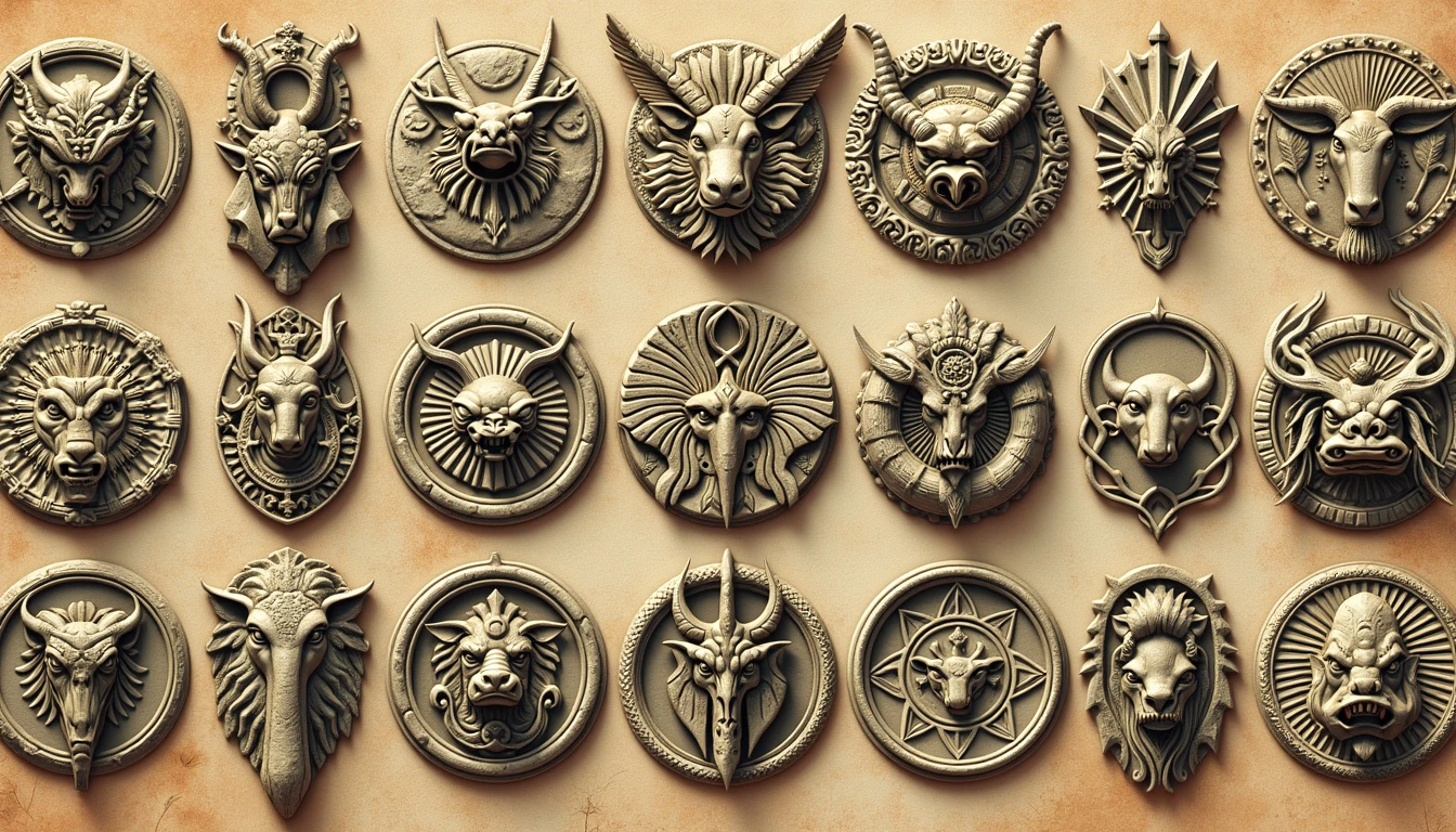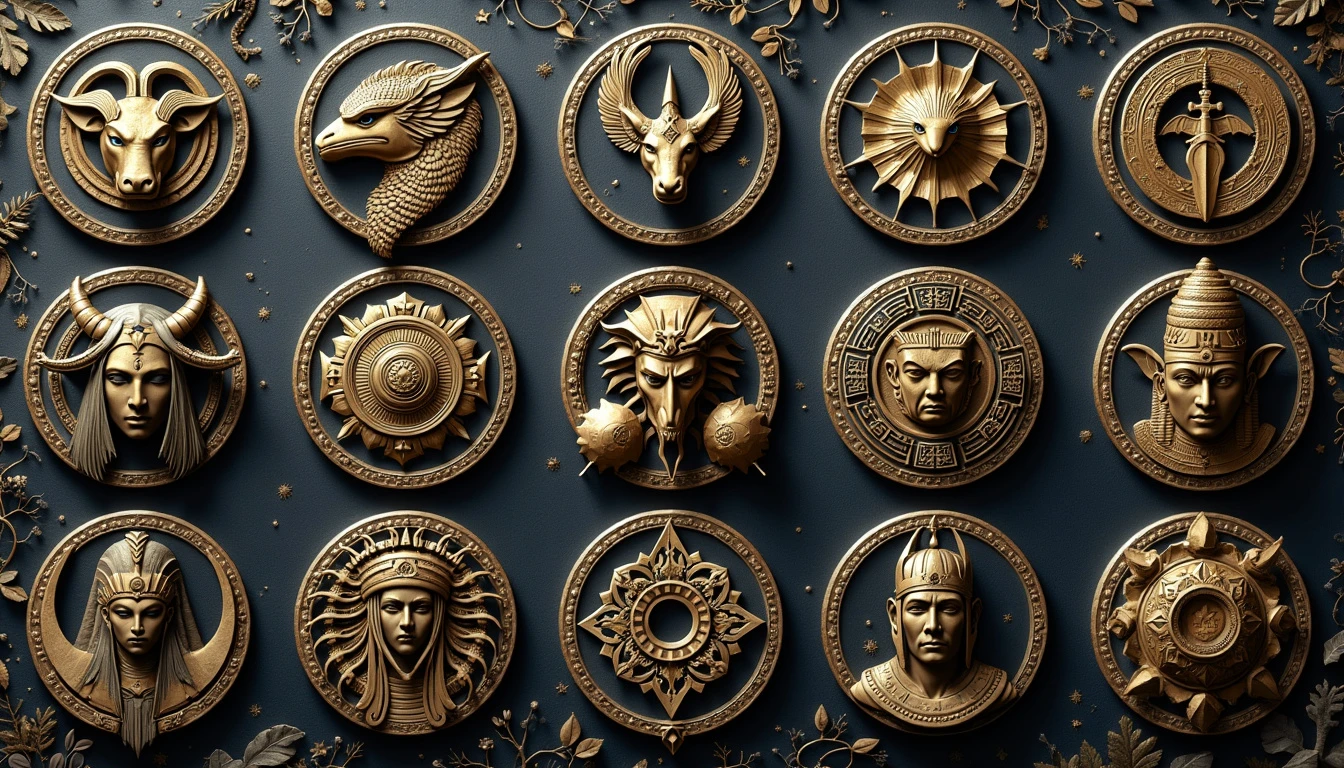 24 circular places for placing logos, design about mythology, high details, high resolution, greek, norsk, egyptian, aztec and japanese mythologies,