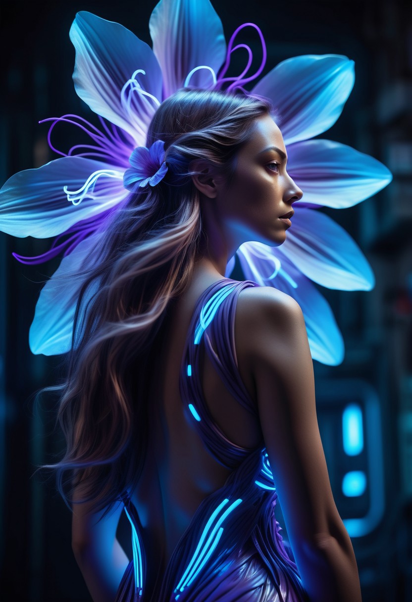 art photography, photorealistic, woman with long flowing hair, giant flower with bioluminescent circuitry patterns in back, glowing blue and purple, high contrast, sharp focus, dramatic composition, cinematic lighting, ethereal, glowing, beautiful woman, futuristic Grecian dress with glowing circuitry, soft lighting, shallow depth of field, off-center composition, detailed, intricate, cyberpunk, neon lighting, cool blues and purples, warm skin tones, harmonious future, technological enhancements, natural beauty
