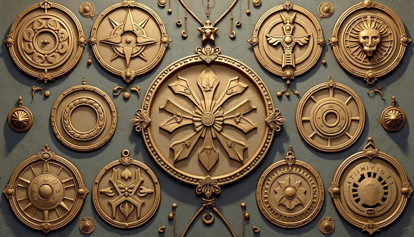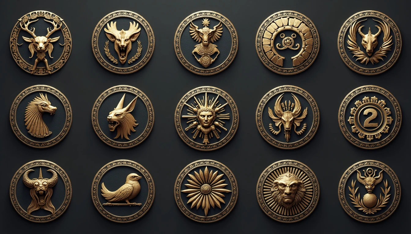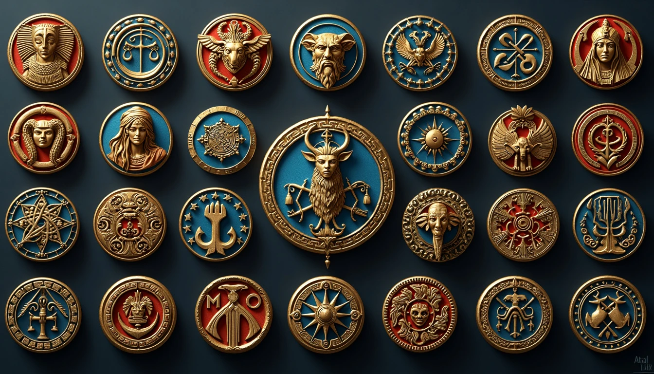 24 circular places for placing logos, design about mythology, high details, high resolution, greek, norsk, egyptian, aztec and japanese mythologies,