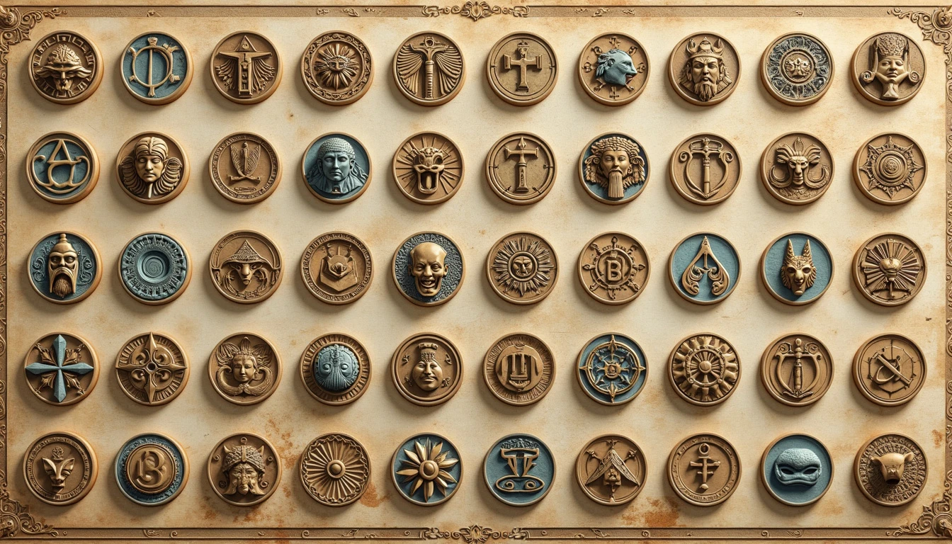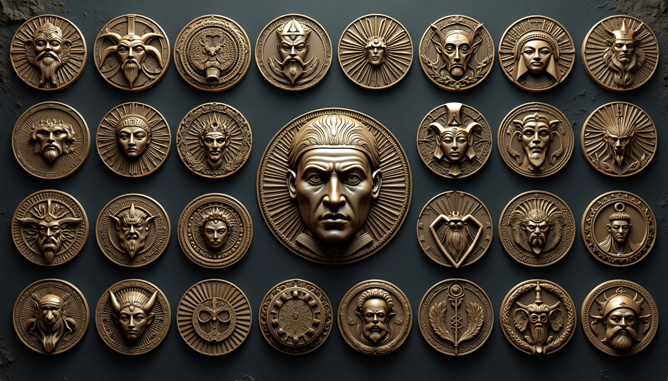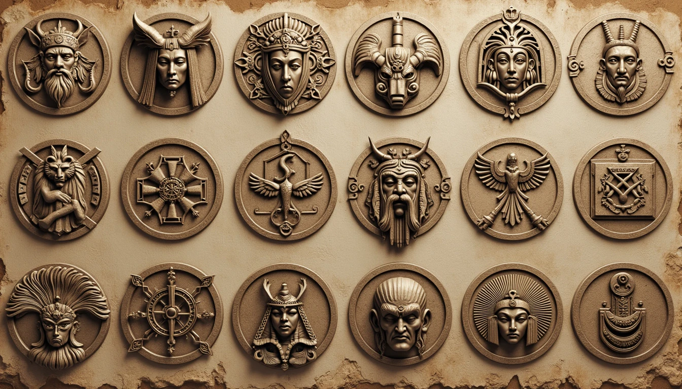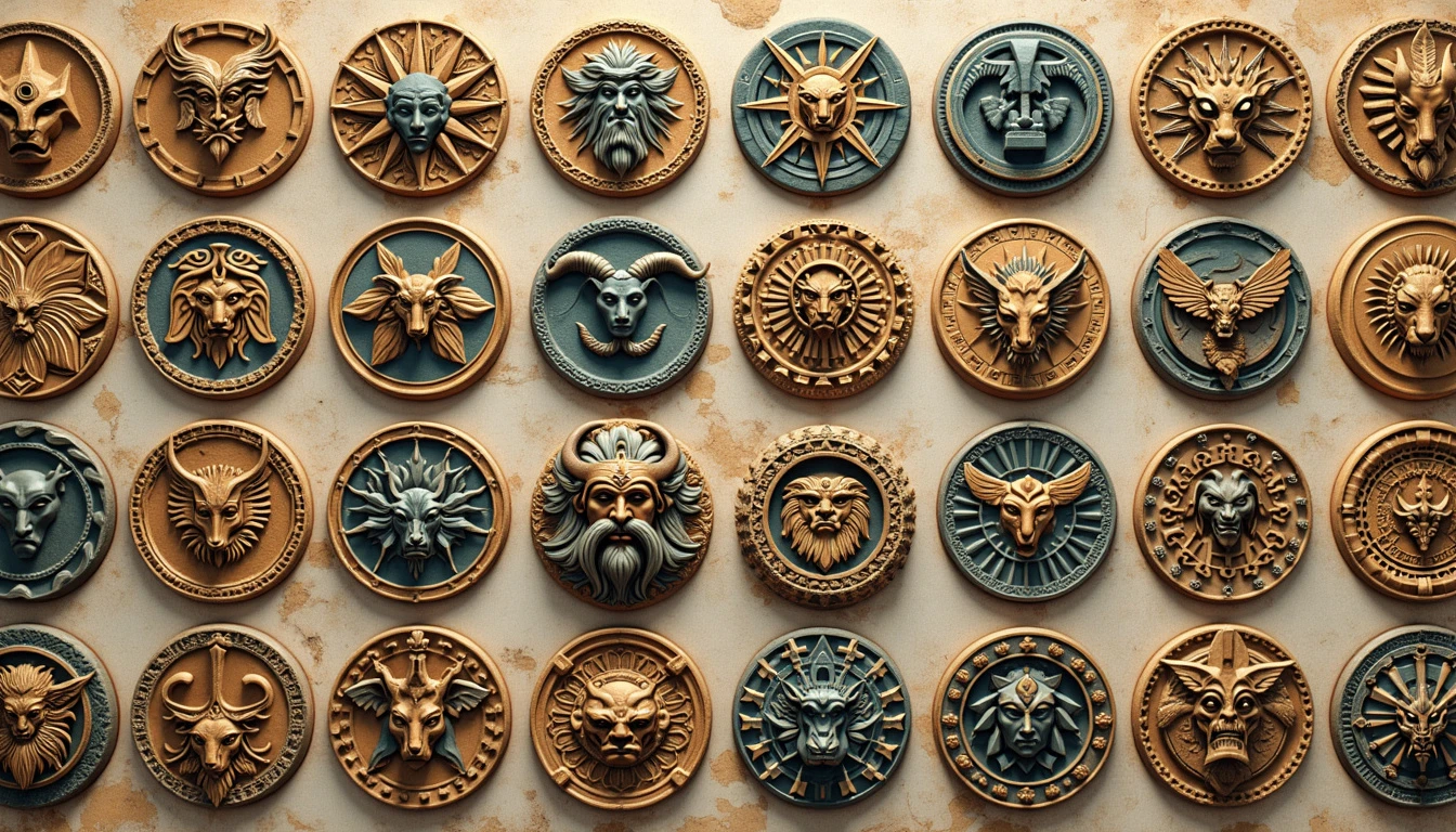 24 circular places for placing logos, design about mythology, high details, high resolution, greek, norsk, egyptian, aztec and japanese gods symbols,