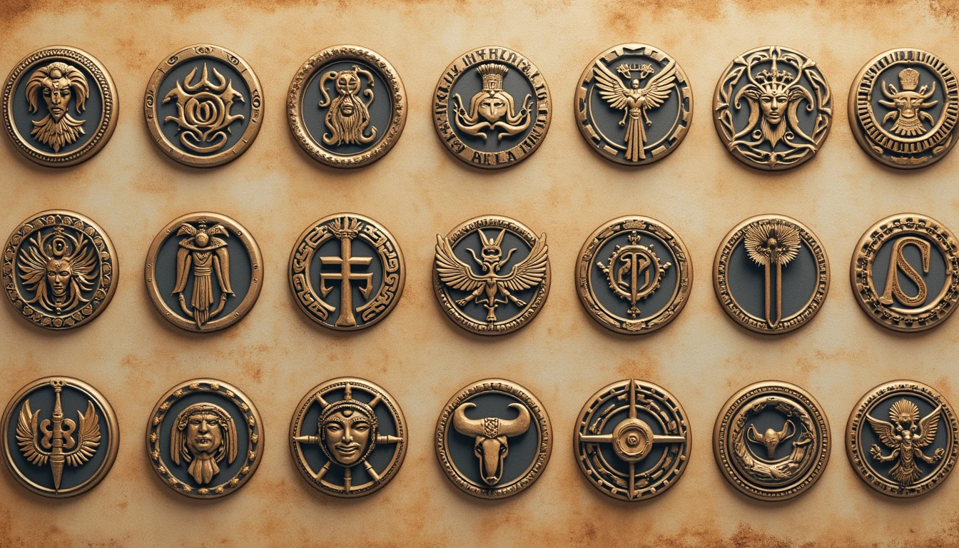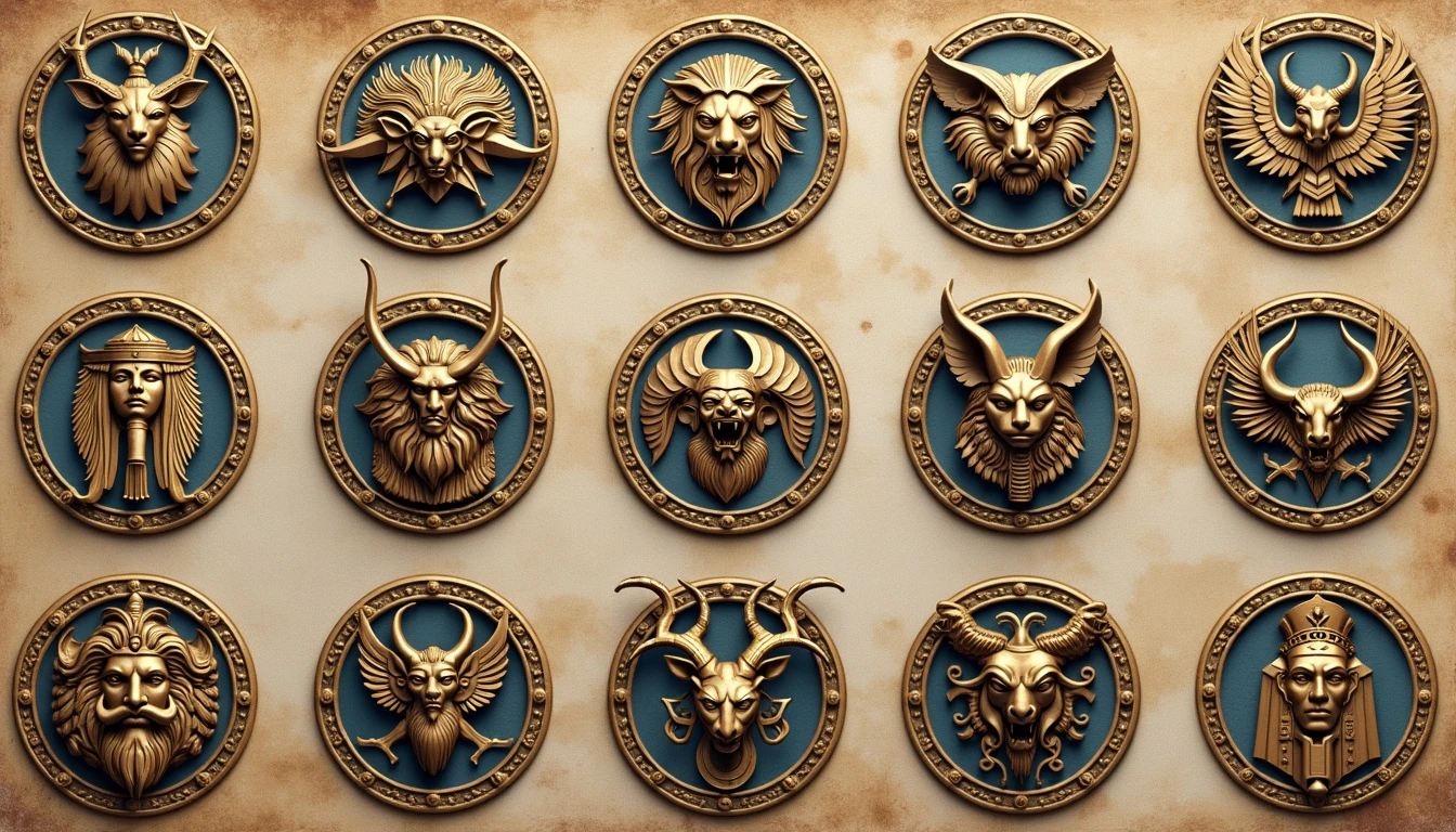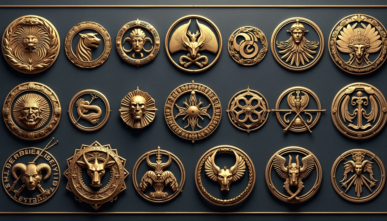 24 circular places for placing logos, design about mythology, high details, high resolution, greek, norsk, egyptian, aztec and japanese gods symbols,