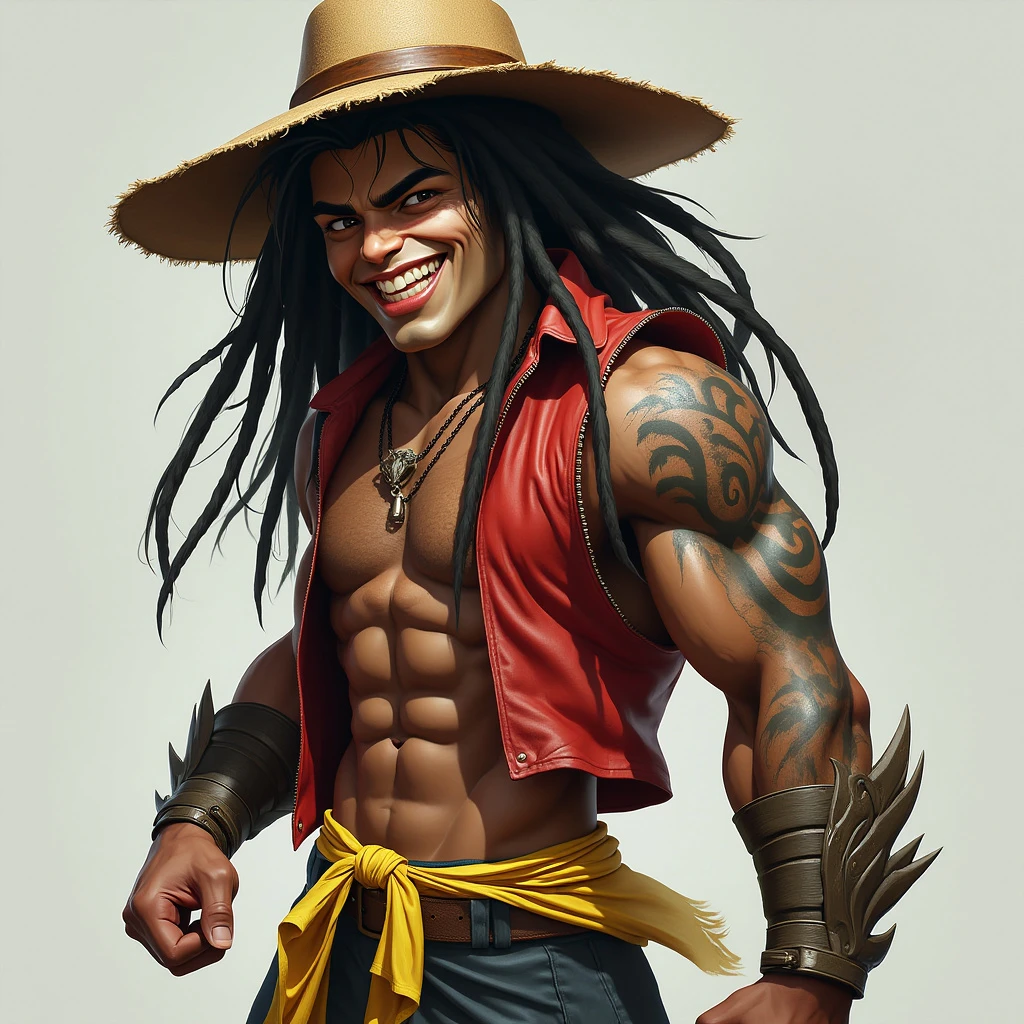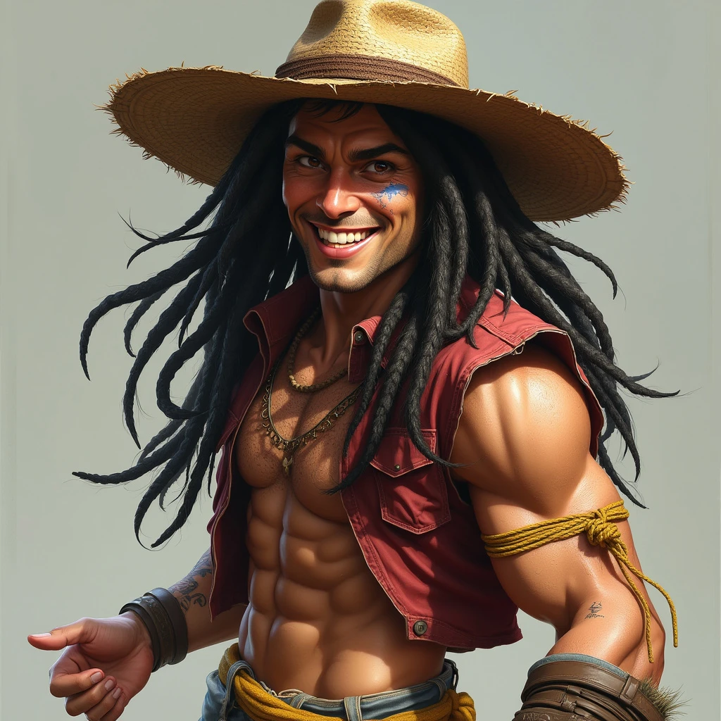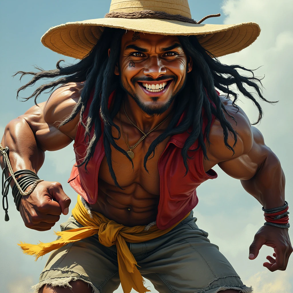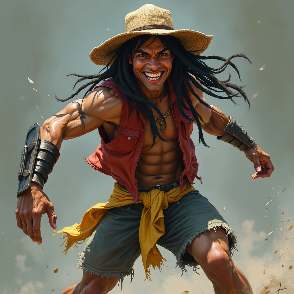 Create an ultra-realistic digital painting of Predator “The Predator,” capturing him as if he were a real person. The painting should eliminate any animated or cartoonish elements, focusing entirely on realistic, human-like realism. Visual Details: Face: Predator’s face should be depicted with realistic skin texture, showing natural pores, subtle blemishes, and a slightly tanned complexion indicative of long days in the sun. His wide smile should be realistic, with detailed teeth, and the iconic scar under his left eye rendered with accurate, believable depth. The overall expression should reflect his adventurous spirit and unwavering determination. Eyes: His eyes should be brown, full of intensity and life, with realistic reflections of light. The pupils should be detailed, capturing a sense of depth and emotion, conveying his determination and playful nature. Hair: Predator’s black hair should be realistically tousled, with each individual strand detailed, reflecting a natural sheen as it catches the light. Hair should appear slightly windblown, adding to the overall realism of his adventurous, outdoor lifestyle. Hat: The straw hat should appear worn and textured, with visible straw fibers and slight discoloration from exposure to the elements. The hat should cast a natural shadow across his face, adding depth and realism. Attire: Clothing: The Predator's red vest should be rendered in a way that shows the texture of the fabric, with slight wear from his many adventures. His muscular torso should be visible, with realistic skin tones and detailed scars from past battles. His shorts should appear to be made of heavy, durable fabric like denim, showing creases and natural wear. His sandals should also appear well-worn, with details such as frayed edges and scuffed soles. Accessories: The yellow sash tied around his waist should show realistic folds and shadows, adding to the overall realistic appearance. Pose: Dynamic Pose: Capture the Predator in a powerful pose, mid-action, with one arm outstretched as if he were about to perform a “Gomu Gomu no” attack. The muscles in his arm and body should be realistically detailed, showing tension and movement. His posture should convey readiness and strength, with every detail contributing to the realism of the scene. Context: Setting: The setting should represent a hyper-realistic ocean scene, with the deep blue sea and the Thousand Sunny ship visible in the distance. The sky should be clear, with some clouds, and the sunlight should reflect off the water, creating a stunning, realistic seascape. The waves should appear dynamic, with the light catching their crests, adding to the realism. Lighting: Natural lighting should be used to highlight the textures and details of the Predator figure, with the sunlight casting realistic shadows and creating depth. The overall atmosphere should evoke a sense of adventure and the vastness of the open sea. Artistic style: Hyper-realistic: Every detail, from the texture of his skin to the fibers of his clothing to the glow in his eyes, must be rendered with photographic accuracy. The painting should eliminate all traces of animation, focusing entirely on realism, as if the Predator were a real, living person. Color palette: Use natural but vibrant colors that enhance the realism of the scene. Reds, blues, and yellows should be bold but believable, creating a vivid but realistic image.