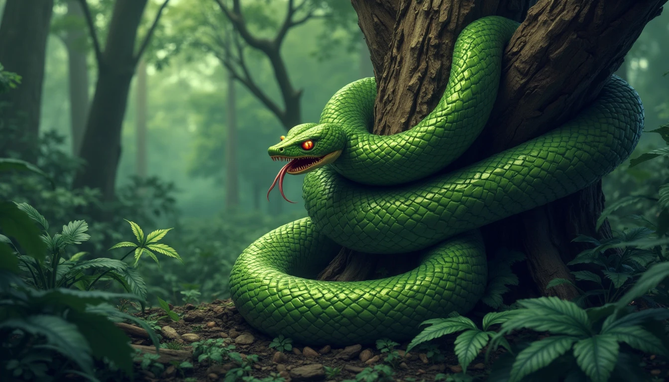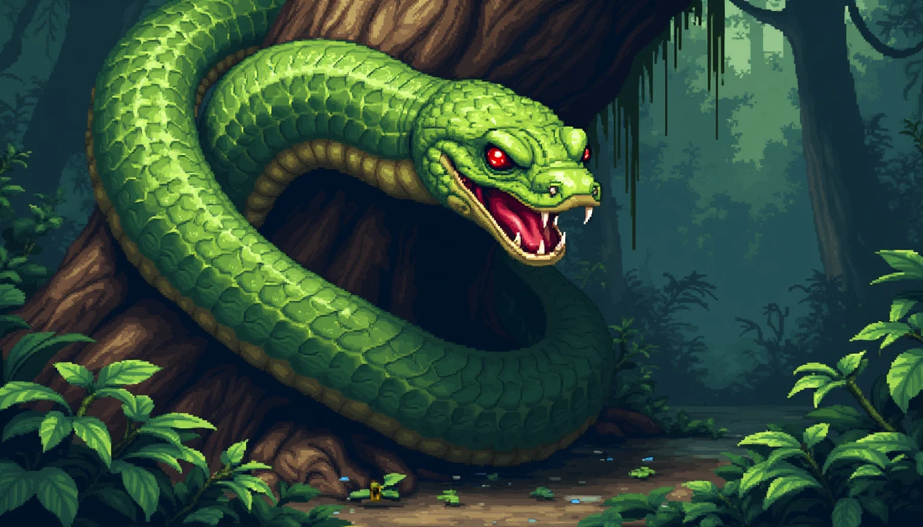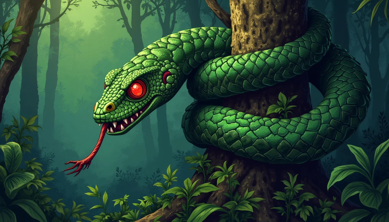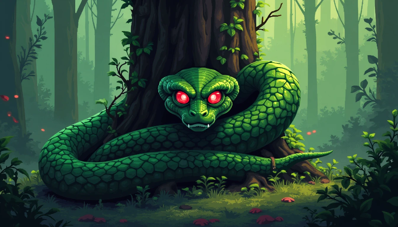 Create an image with a video game aesthetic. It's called "Centipede". The snake is green and has scary red eyes. Great detail. The snake should appear coiled around a tree in a rainforest.