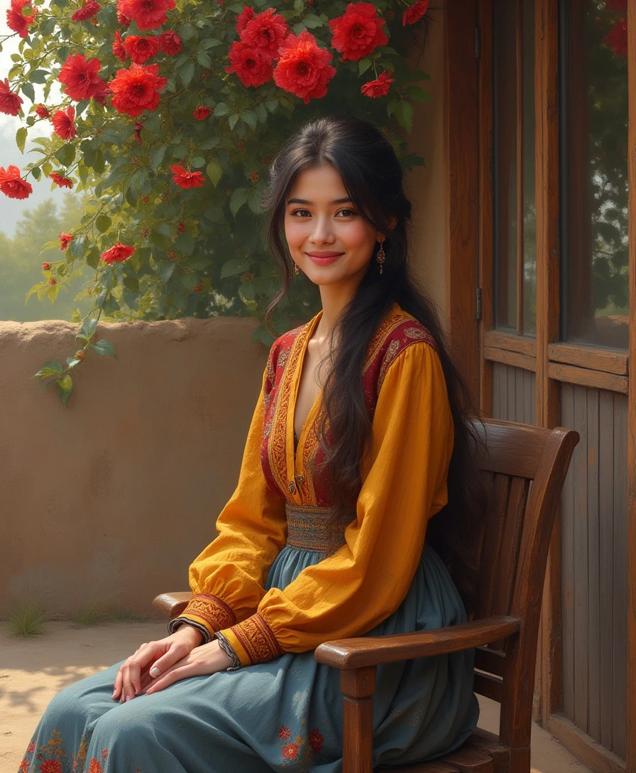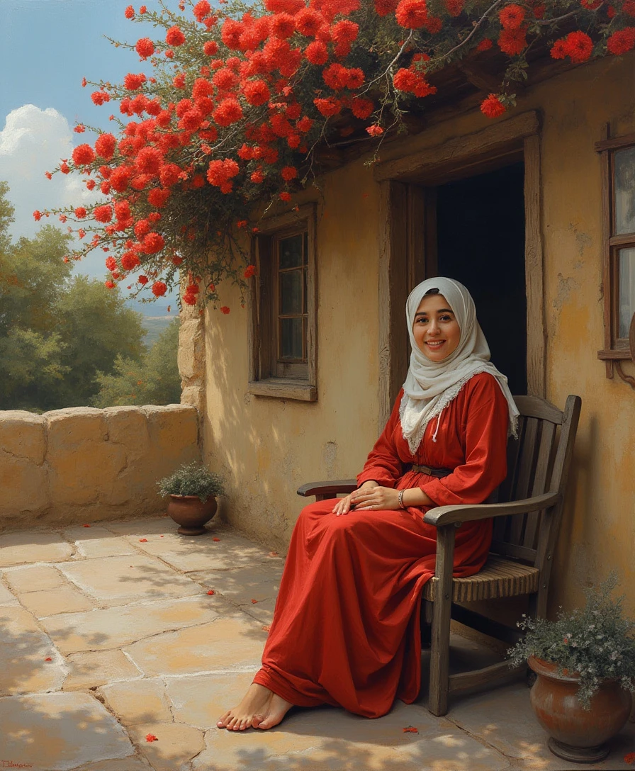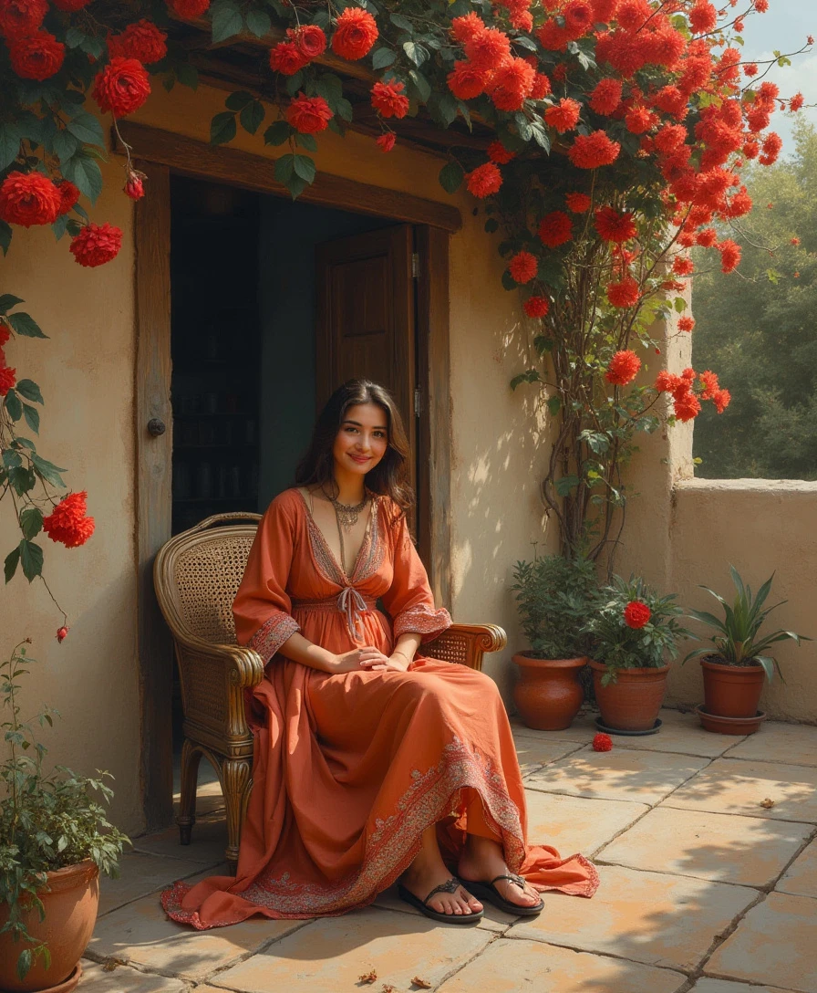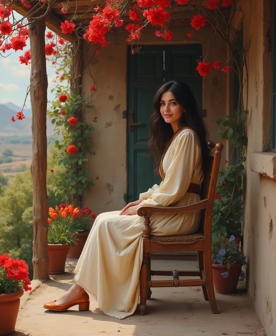 The image of a beautiful and kind persian , with usual daily dress ,sitting on a chair , Sitting on the terrace of the wooden house, Red flower pergola on mud walls , and looking at the camera with a kind smile , art oil painting style