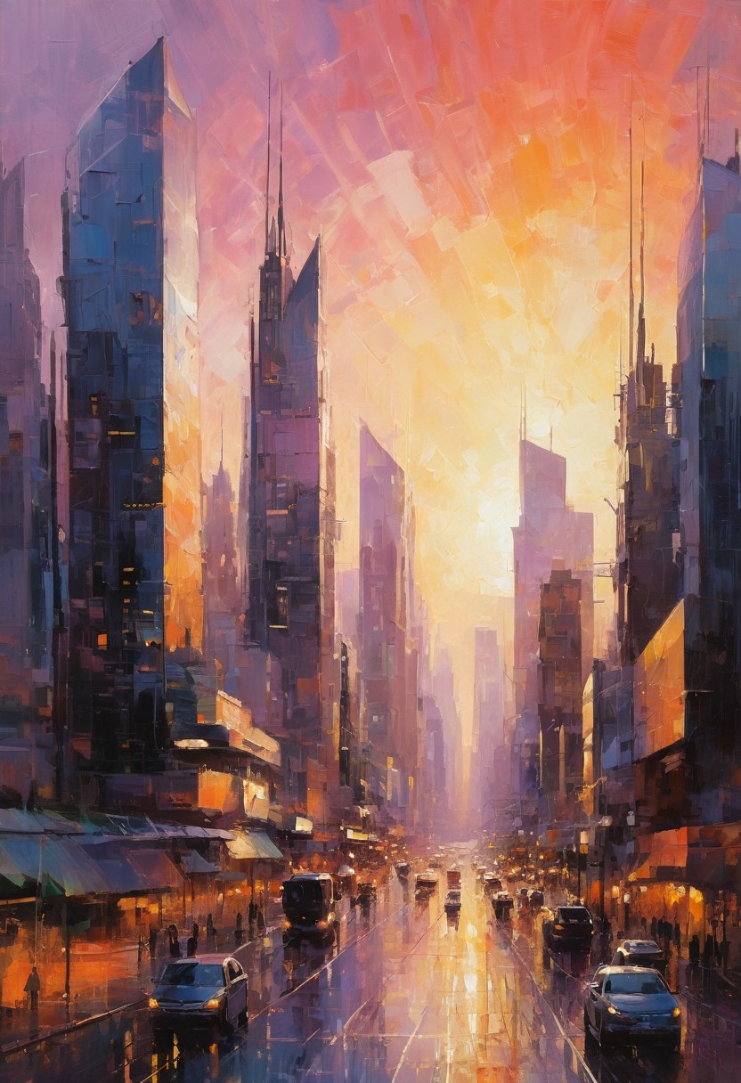 Depict a sprawling, futuristic cityscape at morning ,illuminated by the soft glow of sun lights, in the style of Impressionism. Focus on creating a harmonious blend of the artificial and the natural, showcasing the contrast between the organic brush strokes and the geometric precision of futuristic architecture. Employ a wide aspect ratio to convey the vastness of the urban environment, with a careful application of colour theory to capture the fleeting beauty of twilight.