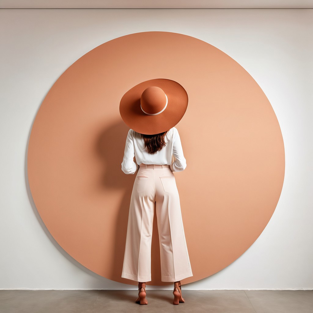 A minimalist, surreal photograph featuring a woman with her back to the camera. She is wearing white high-waisted trousers and a large, round, terracotta-colored hat that covers her head. The background is a large, flat, peach-colored circle against a clean white wall, with the circle perfectly aligned with the hat, creating a visually striking composition. The woman's pose is relaxed and her arms are crossed in front of her, adding a subtle human element to the otherwise abstract and geometric scene. The overall aesthetic is soft, minimalistic, and artistically balanced.