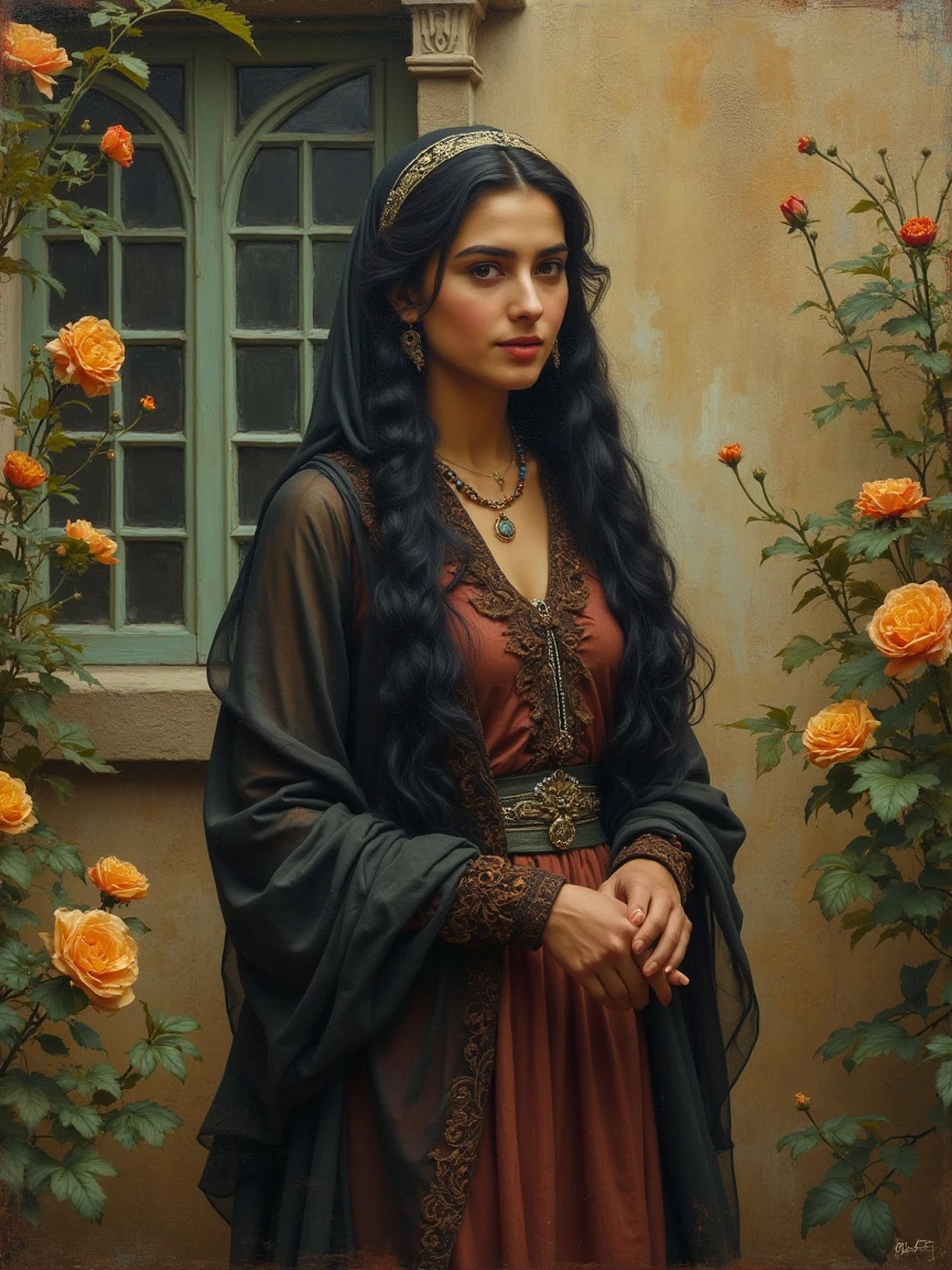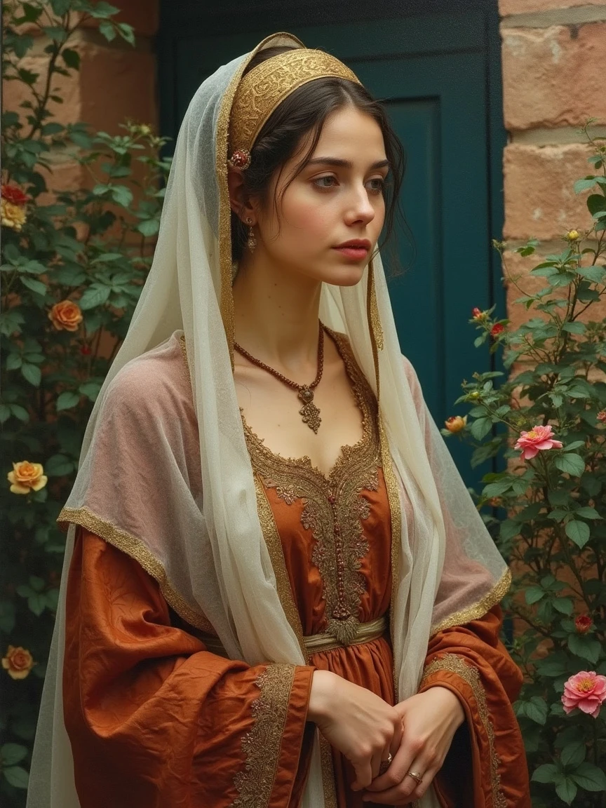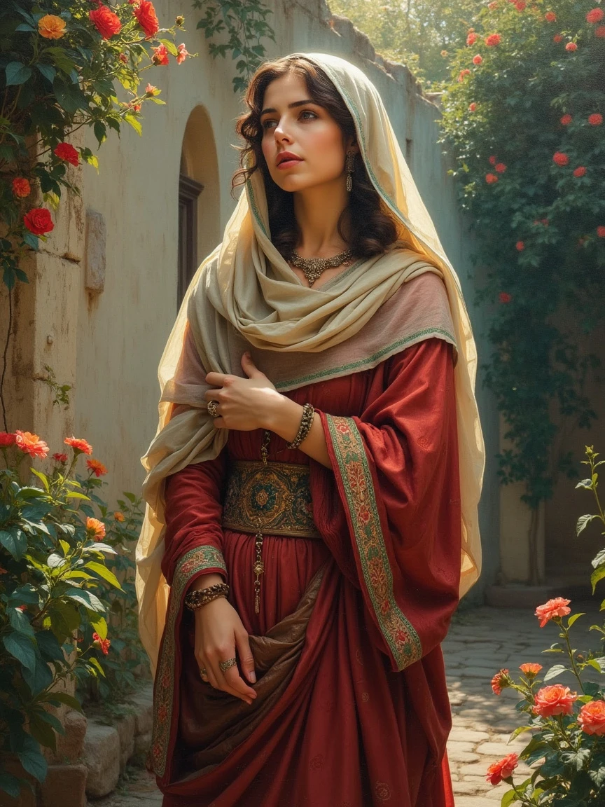 The image of a beautiful and kind Persian woman , A Mother-in-Waiting , in persian old garden , art oil painting style , art oil painting style