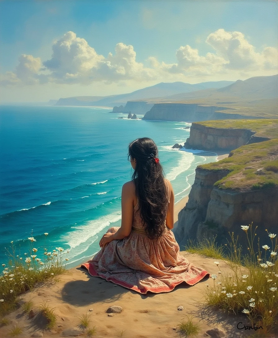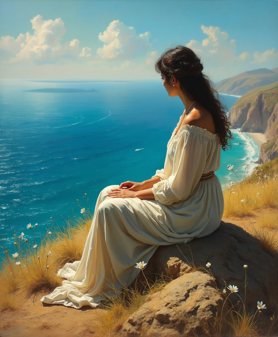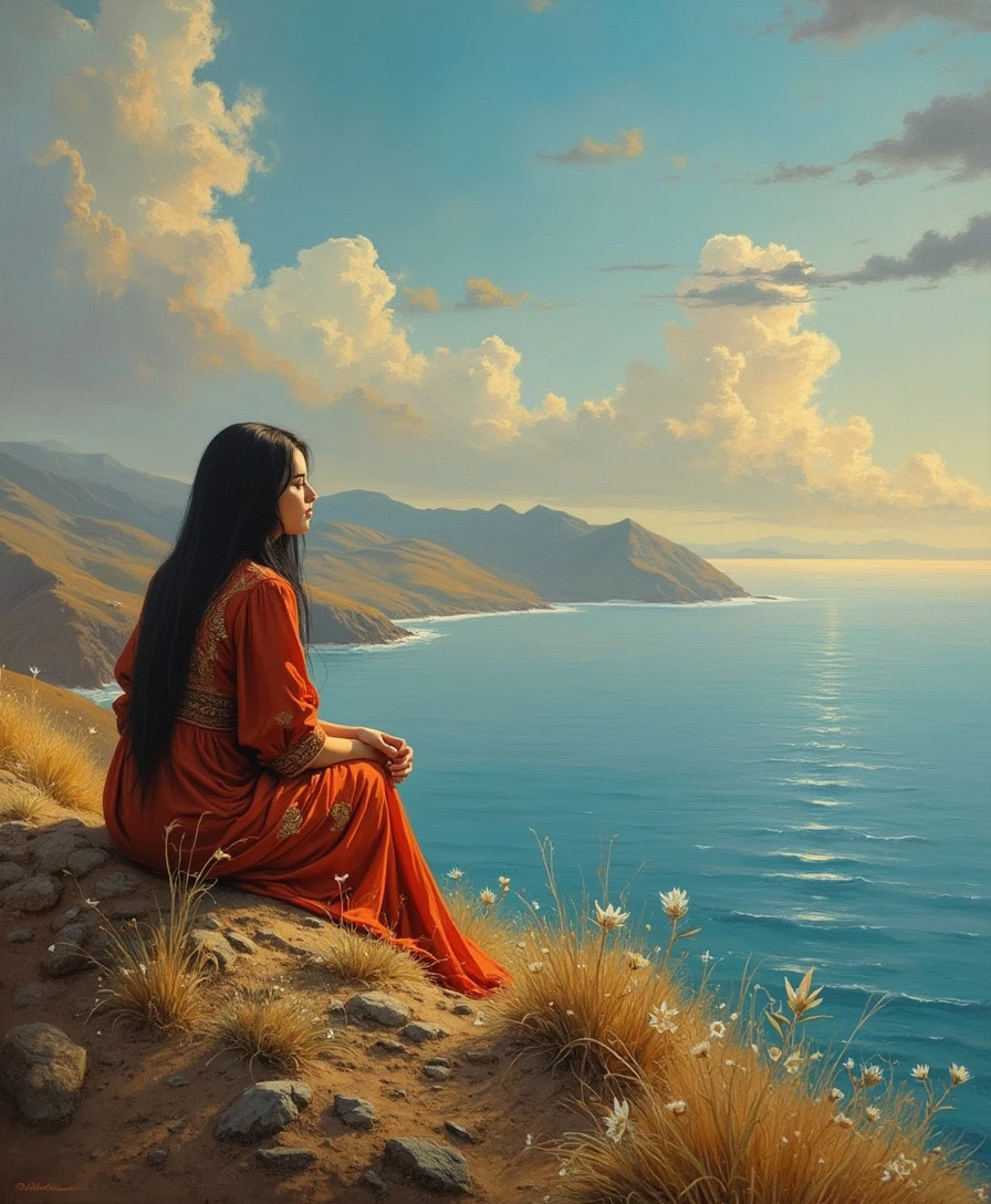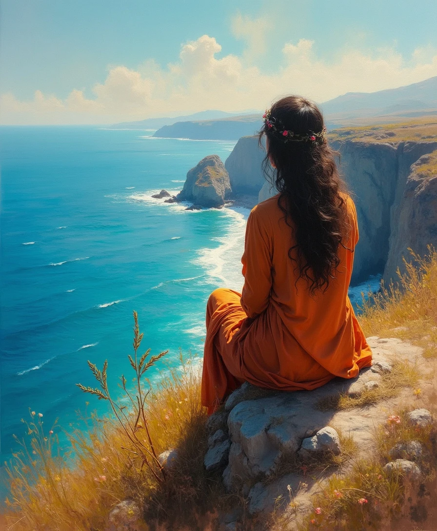 A persian woman is sitting on a high hill overlooking the sea with her hands on her knees and looking at the sea , art oil painting style