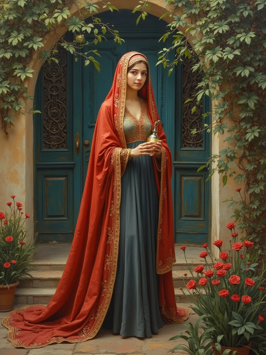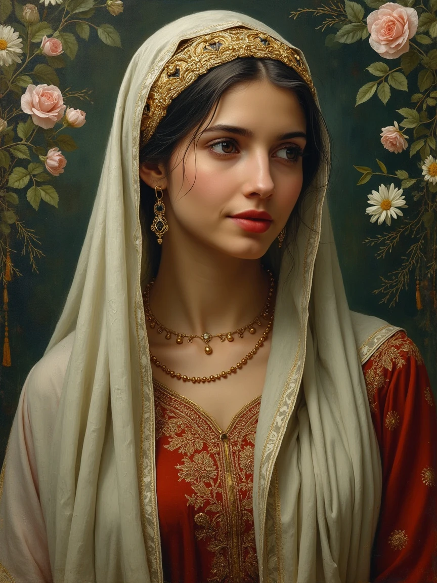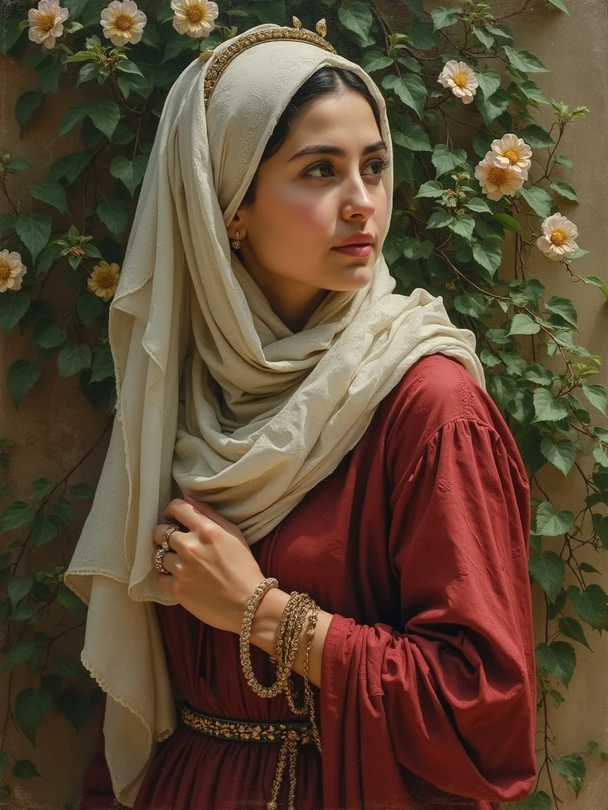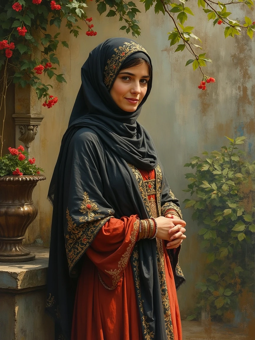The image of a beautiful and kind Persian woman , A Mother-in-Waiting , in persian old garden , art oil painting style , art oil painting style