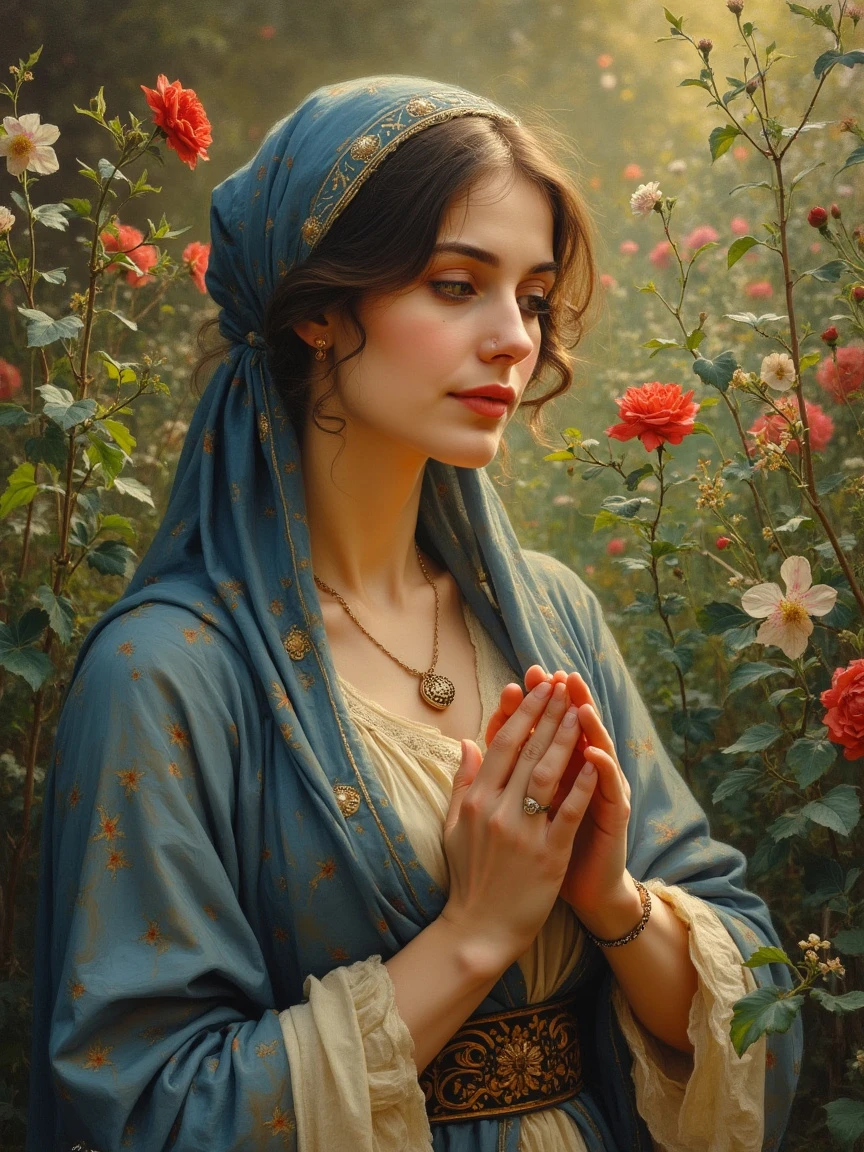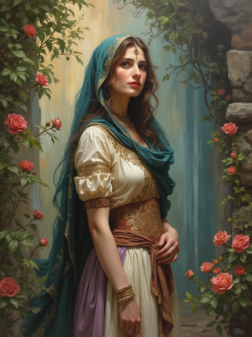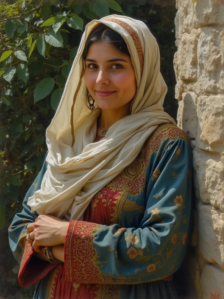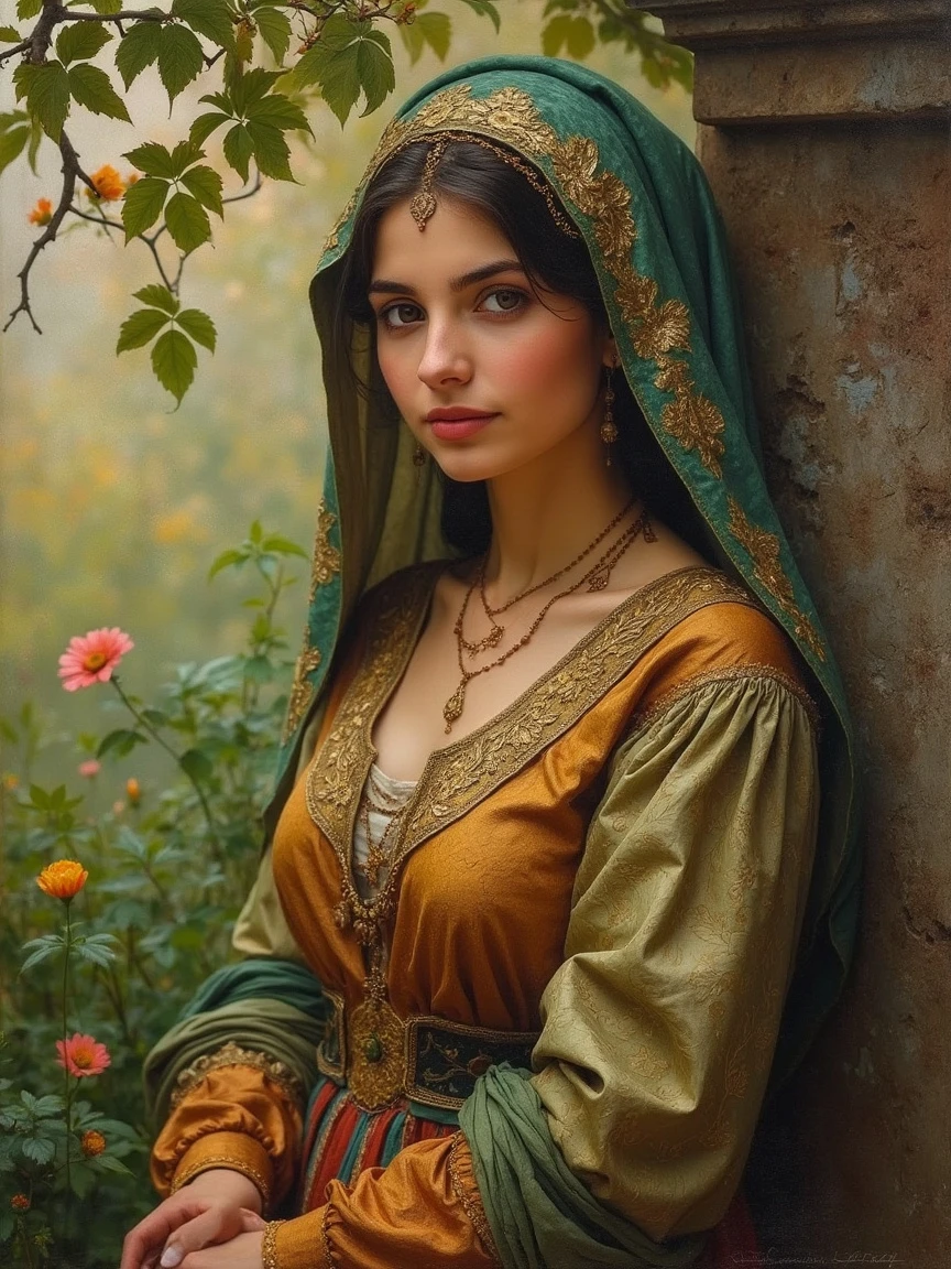 The image of a beautiful and kind Persian woman , A Mother-in-Waiting , in persian old garden , art oil painting style , art oil painting style