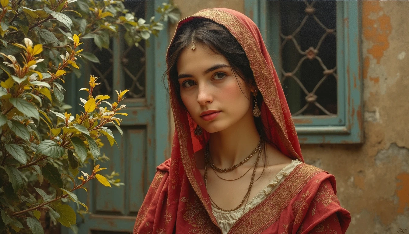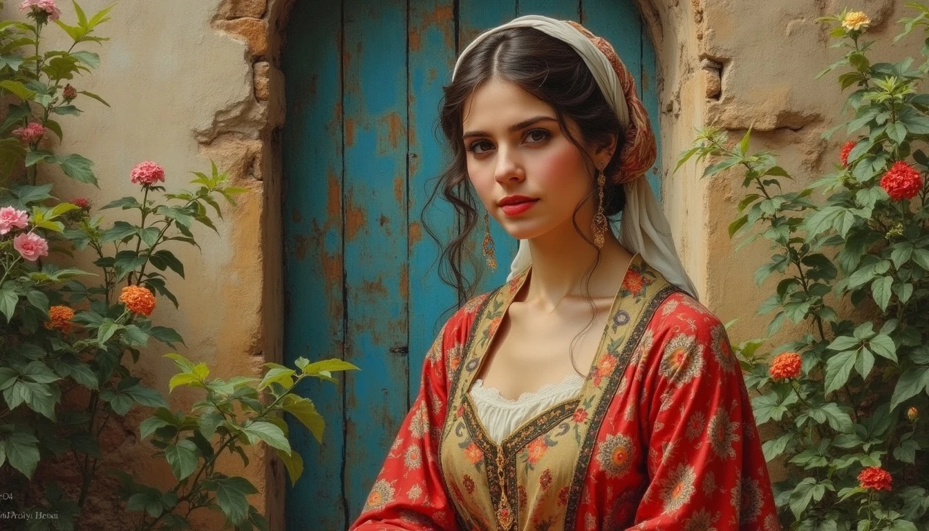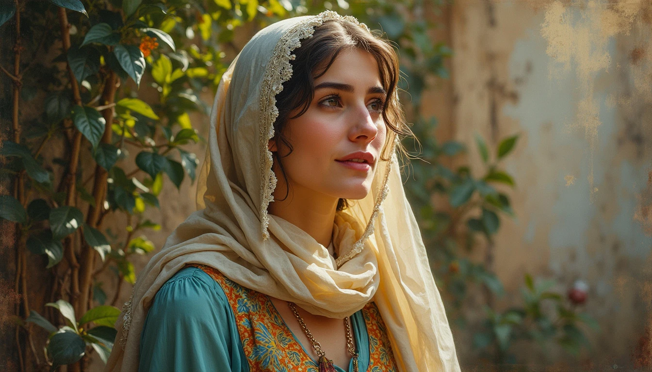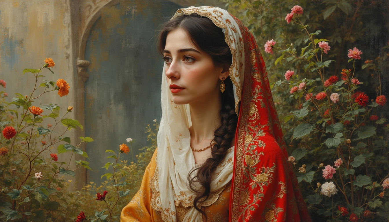 The image of a beautiful and kind Persian woman , A Mother-in-Waiting , in persian old garden , art oil painting style , art oil painting style
