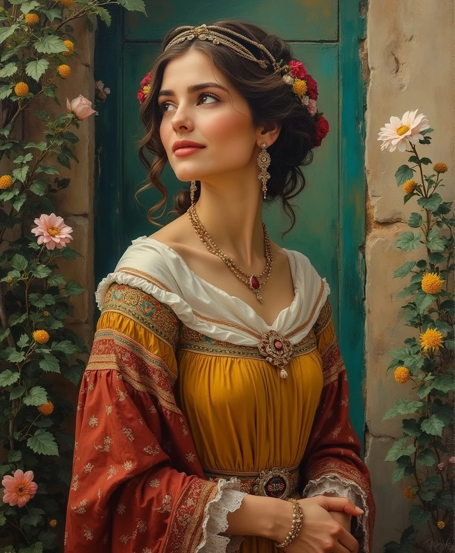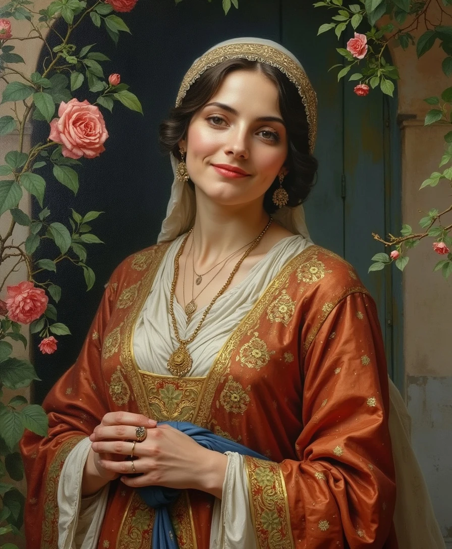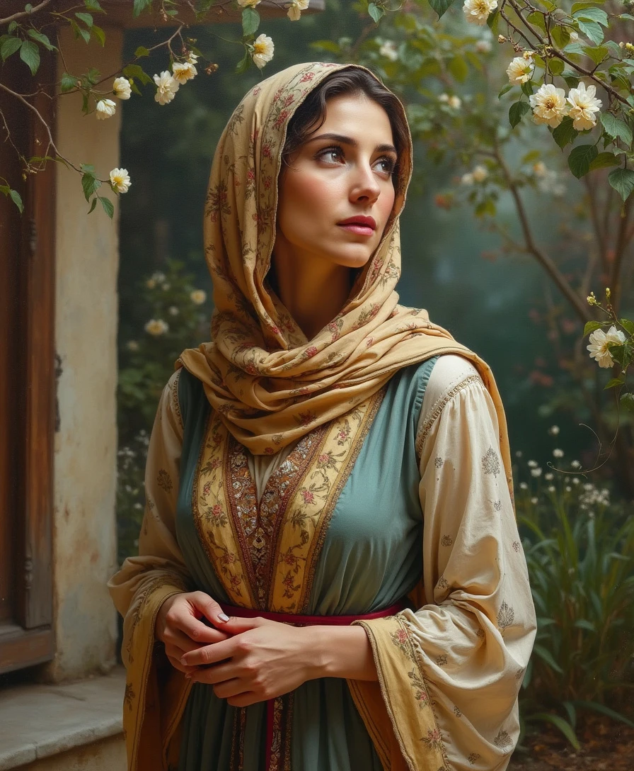 The image of a beautiful and kind Persian woman , A Mother-in-Waiting , in persian old garden , art oil painting style , art oil painting style