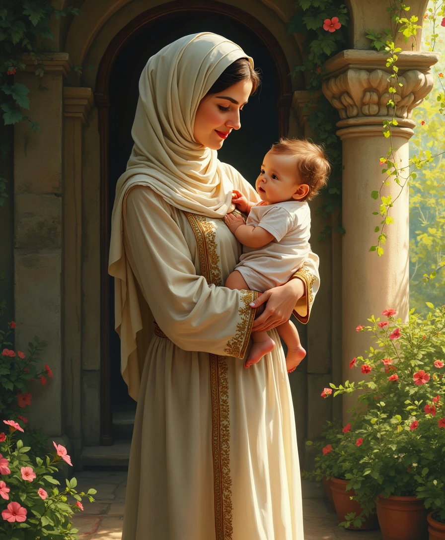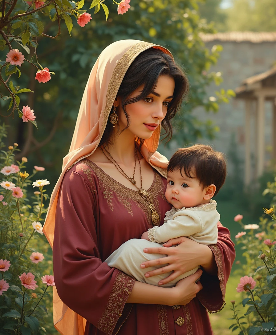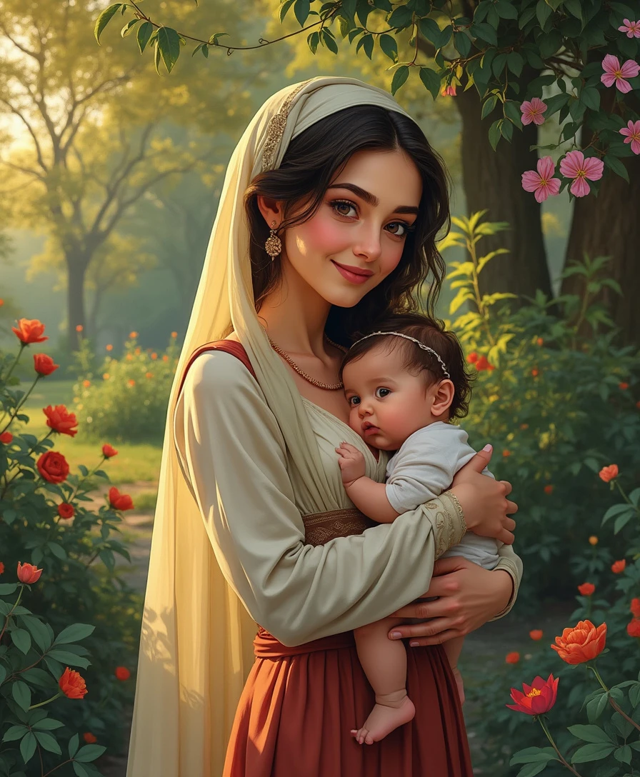 The image of a beautiful and kind Persian woman , A Mother-in-Waiting , is holding an infant in her arms , in persian old garden , art oil painting style , art oil painting style
