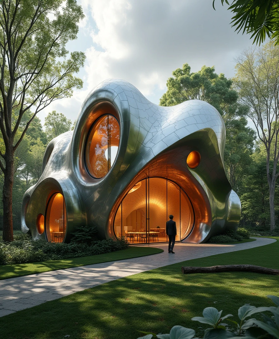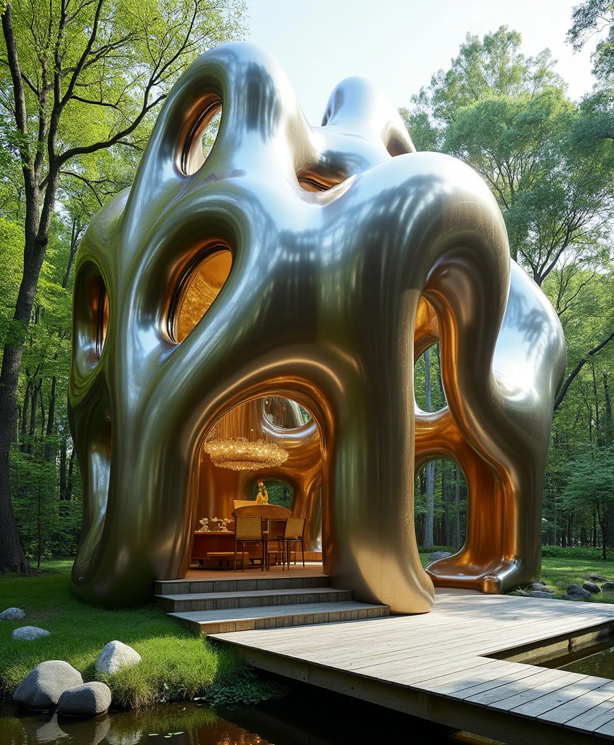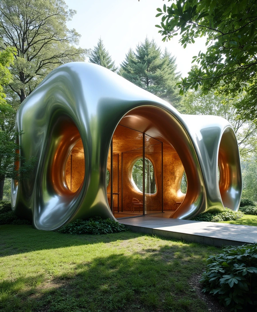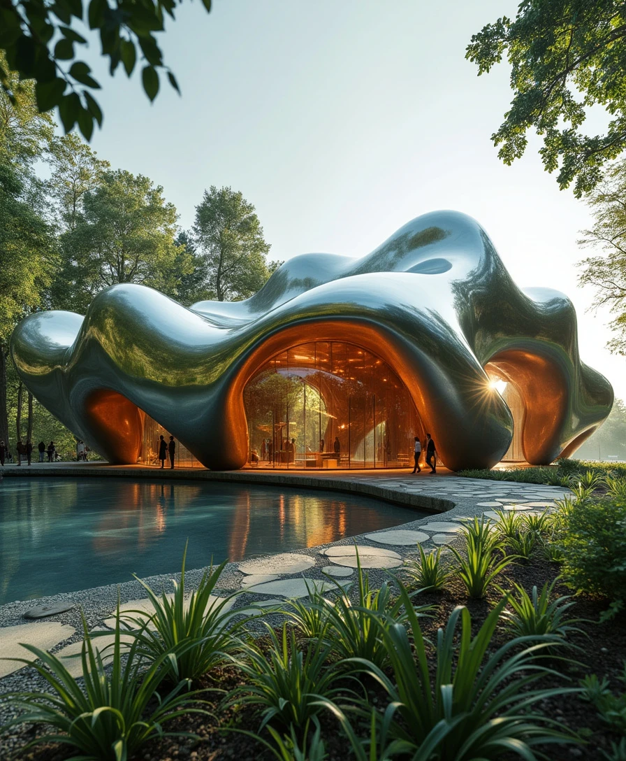 A pavilion with a futuristic design, featuring kinetic facades made from molten metal that move and shift in response to environmental conditions. Inspired by Heatherwick Studio, the structure is characterized by its organic, flowing shapes and innovative use of materials. The facades are highly reflective, capturing the surrounding landscape and changing with the light throughout the day. The pavilion is set in a serene, natural environment, with lush greenery contrasting against the metallic surfaces. The design blends modern technology with an artistic, almost whimsical approach, creating a space that feels both futuristic and connected to nature. The composition emphasizes the pavilion's dynamic nature, intricate details, and the harmonious relationship between architecture and the environment.