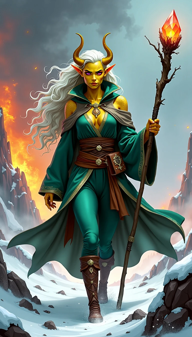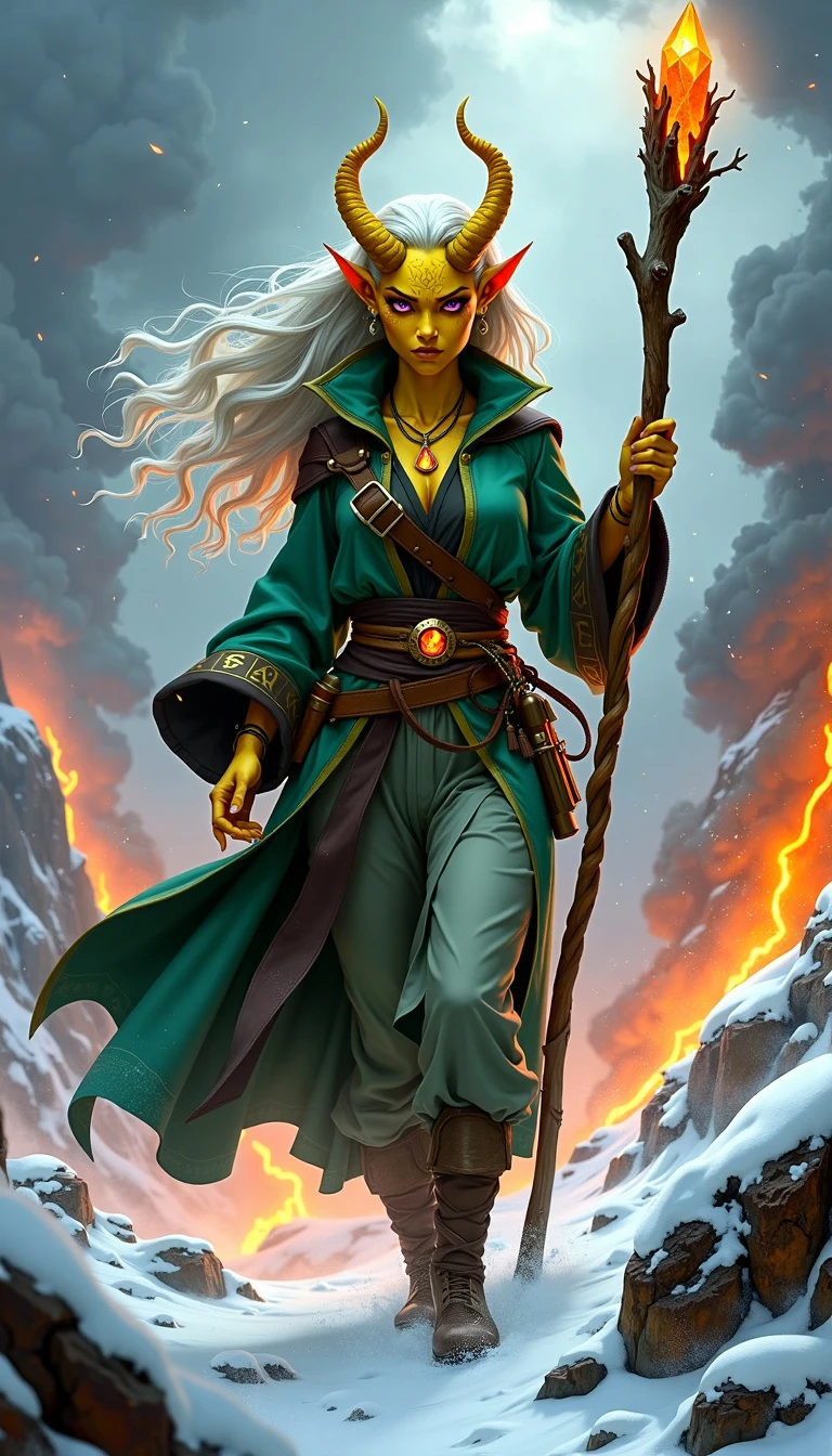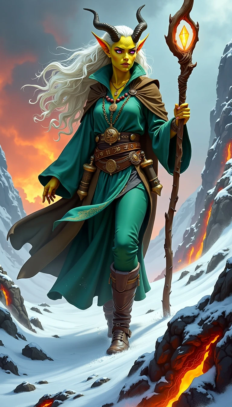 Create a full-body shot of a tiefling maiden braving an extreme and dramatic landscape where fierce snowstorms meet volcanic eruptions. Her skin is a striking yellow mustard color with intricate patterns and designs, including delicate, scale-like textures that add depth and detail. She has two flesh-toned yellow horns elegantly curving from her forehead. Her vivid purple eyes stand out against the tumultuous environment, and her long, curly white hair flows dramatically in the storm. The tiefling maiden's outfit is designed to handle the harsh conditions, incorporating a rich palette of colors. Her attire features deep emerald green as a primary color, complemented by accents of dark brown, and hints of cool slate gray. The outfit includes rugged furs and enchanted fabrics, with a high, reinforced collar and a full-length cloak. The additional colors provide visual interest and contrast, ensuring that the outfit works well with her yellow mustard skin while maintaining functionality and style. The design blends elements reminiscent of Jedi robes with traditional influences from "Avatar: The Last Airbender" and "Korra," with layered fabrics and detailed patterns that enhance her protection and presence. It has pants. She wields a staff made from twisted wood and embedded with glowing runes, which serves as both a walking aid and a weapon. The staff's ethereal light complements her mystical theme and adds to her formidable presence in the storm. Around her neck, she wears a simple pendant with a glowing crystal that pulses in sync with the chaotic forces of her surroundings. The background features an extreme and breathtaking clash of elements. An immense snowstorm rages with blizzard conditions so severe they nearly obscure the terrain, combined with intense volcanic activity. Rivers of molten lava cut through the snow-covered landscape, and the sky is filled with ash and fiery streaks. This dramatic contrast of ice and fire highlights the tiefling maiden’s strength and resilience in navigating this perilous environment. The artwork should embody this epic and fantastical scene in the distinctive, stylized drawing style of Lucas Werneck, capturing the harsh conditions of the environment and the tiefling maiden’s heroic stance, with detailed patterns on her skin and a richly colored, intricately designed outfit.