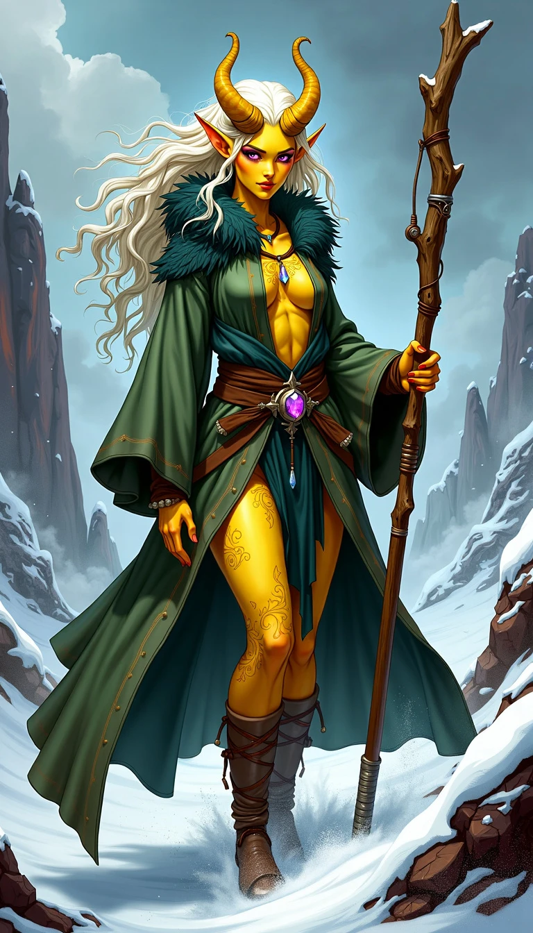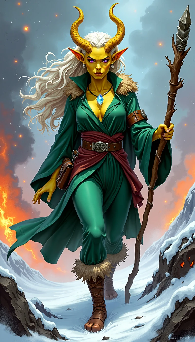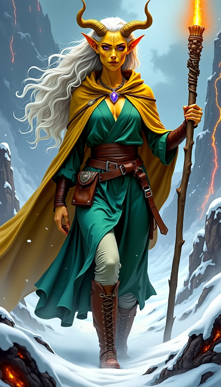 Create a full-body shot of a tiefling maiden braving an extreme and dramatic landscape where fierce snowstorms meet volcanic eruptions. Her skin is a striking yellow mustard color with intricate patterns and designs, including delicate, scale-like textures that add depth and detail. She has two flesh-toned yellow horns elegantly curving from her forehead. Her vivid purple eyes stand out against the tumultuous environment, and her long, curly white hair flows dramatically in the storm. The tiefling maiden's outfit is designed to handle the harsh conditions, incorporating a rich palette of colors. Her attire features deep emerald green as a primary color, complemented by accents of dark brown, and hints of cool slate gray. The outfit includes rugged furs and enchanted fabrics, with a high, reinforced collar and a full-length cloak. The additional colors provide visual interest and contrast, ensuring that the outfit works well with her yellow mustard skin while maintaining functionality and style. The design blends elements reminiscent of Jedi robes with traditional influences from "Avatar: The Last Airbender" and "Korra," with layered fabrics and detailed patterns that enhance her protection and presence. It has pants. She wields a staff made from twisted wood. which serves as both a walking aid and a weapon. It serves as a lightsaber pike weapon. Around her neck, she wears a simple pendant with a glowing crystal that pulses in sync with the chaotic forces of her surroundings. The background features an extreme and breathtaking clash of elements. An immense snowstorm rages with blizzard conditions so severe they nearly obscure the terrain, combined with intense volcanic activity. Rivers of molten lava cut through the snow-covered landscape, and the sky is filled with ash and fiery streaks. This dramatic contrast of ice and fire highlights the tiefling maiden’s strength and resilience in navigating this perilous environment. The artwork should embody this epic and fantastical scene in the distinctive, stylized drawing style of Lucas Werneck, capturing the harsh conditions of the environment and the tiefling maiden’s heroic stance, with detailed patterns on her skin and a richly colored, intricately designed outfit.