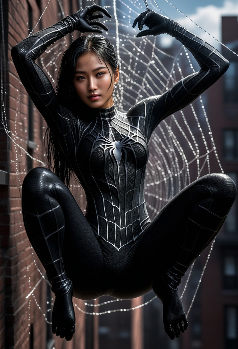 score_9, score_8_up, score_7_up, best quality, realistic, masterpiece, beautiful detail, hyperrealistic, afternoon sky, ((1girl, woman body, large breast)), amazing detailed full body of a cute korean girl, wearing a realistic and highly detailed black raimi spider-man suit, ((defined muscular girl)), professional model wears ultra - detailed black raimi spider - man suit, ultra - detailed and grained black raimi spiderman suit, suit covered entire body and hand, black spiderman gloves, wet, (light smile, swinging on a spider web, black hair), close up, octane render, highly detailed, volumetric, dramatic lighting, (highest quality:1.1), (HDR:1.3), (top quality, best quality), realistic, high definition, sharp contrast between light and shadow, athletic and fit physique, highly detailed and accurate portrayal, photorealistic rendering, tense and alert atmosphere cinematic scene, cinematic lighting, intricate detail skin and facial texture, lifelike expression, accurate character design, interesting and complex background details,