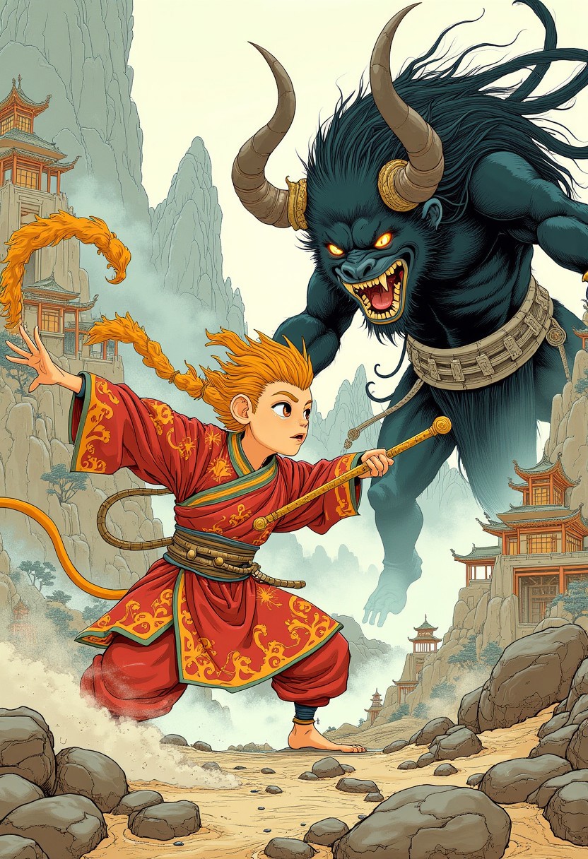 Sun Wukong, the Monkey King, engages in an epic battle against the Bull Demon King, depicted in the style of ancient Chinese ink paintings. Sun Wukong is a dynamic and agile figure with piercing golden eyes, sharp, mischievous features, and a golden furred face framed by a flowing mane of hair. He wears a traditional red and gold warrior’s robe with cloud-like swirling patterns, evoking his heavenly origins, and his iconic phoenix-feather cap. His golden staff, Ruyi Jingu Bang, extends and shrinks with ease as he swings it in fluid arcs, drawn with elegant ink brushstrokes. The Bull Demon King stands formidable in contrast, his massive horns and fierce expression captured in bold, aggressive strokes of deep black ink. The battlefield is a misty, ancient Chinese landscape, surrounded by twisted trees, jagged mountains, and remnants of ruined temples. The environment is portrayed in the style of classical Chinese ink-wash painting, with soft earthy tones accentuated by touches of deep red and golden hues. The scene reflects the traditional lianhuanhua (Chinese comic art) style, blending narrative illustration with refined brushwork. The atmosphere is intense yet harmonious, capturing the mythical essence of these legendary figures in a beautifully balanced composition.