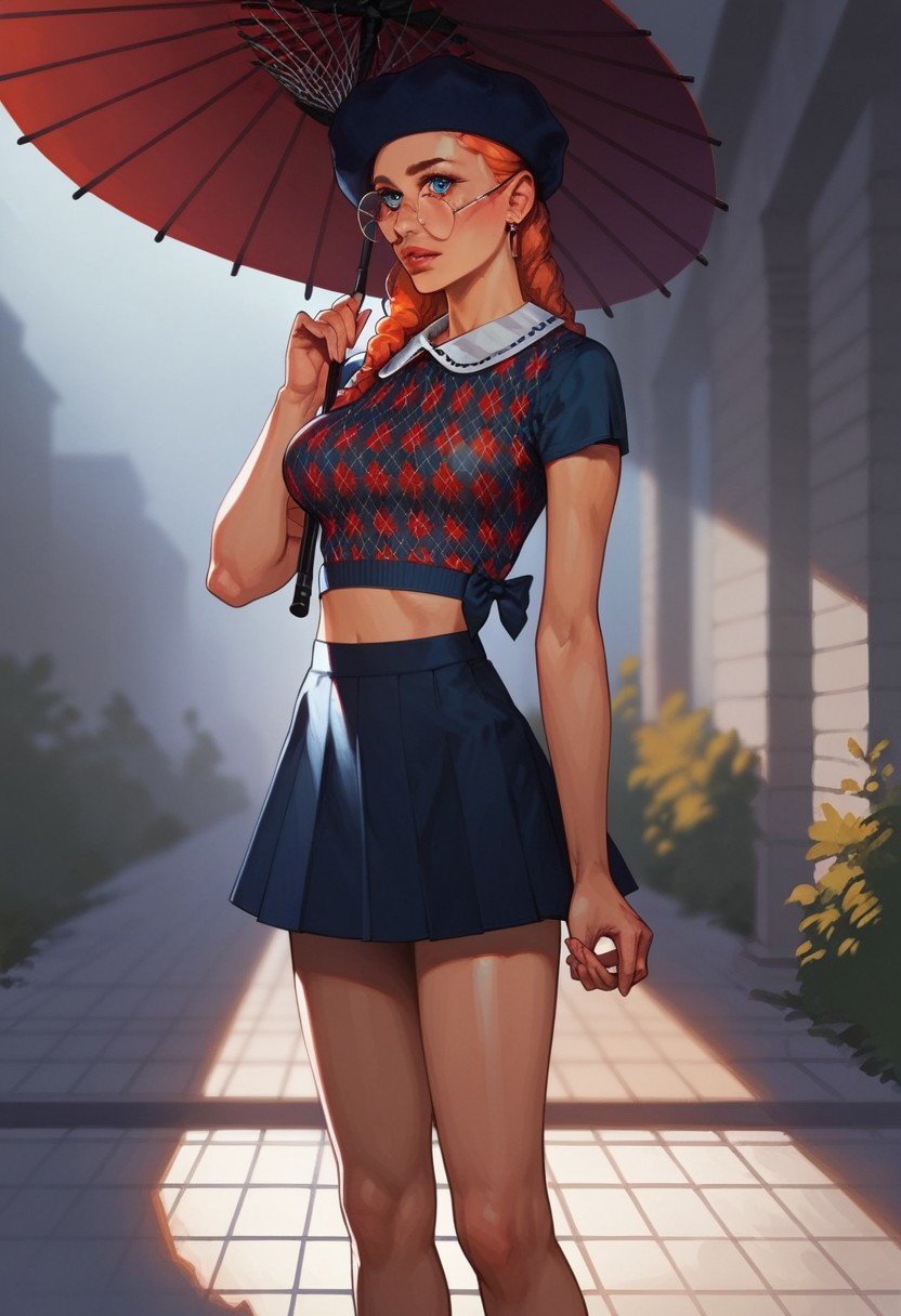 score_9, score_8_up, score_7_up, score_6_up, uncensored, high detail, smooth clear lines, art, character, masterpiece, perfect face, perfect eyes, sexy girl, 1girl, solo, light copper colour hair, loose and slightly curly, blue eyes, medium breasts, firm buttocks, hud_n3rd, hat, crop top, midriff, skirt, upper body, round eyewear, bare feet, standing on a boardwalk, one hand holding a parasol, the other touching her hair, emphasizing her curves and silhouette against the background of ocean water and shining sun. Dynamic pose,