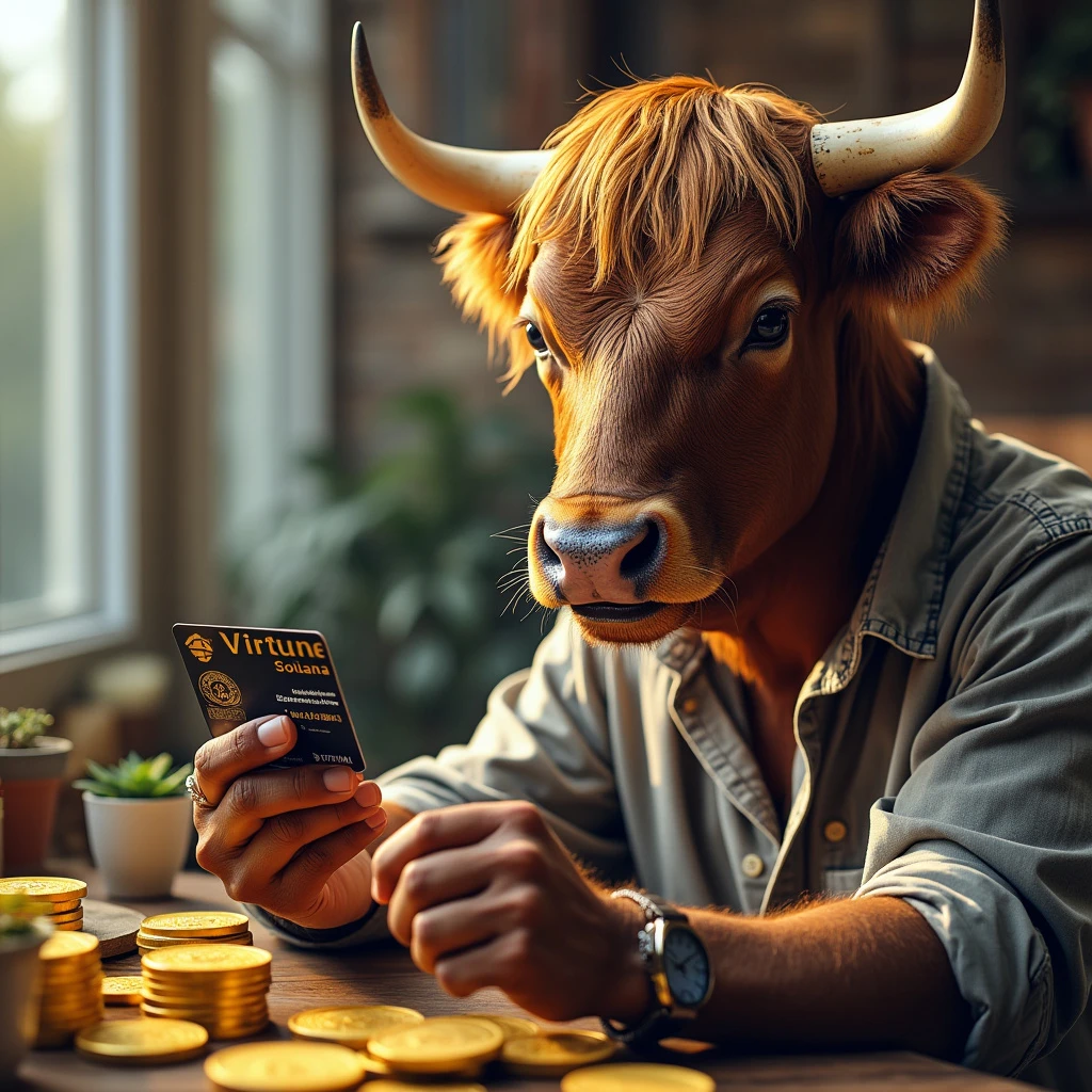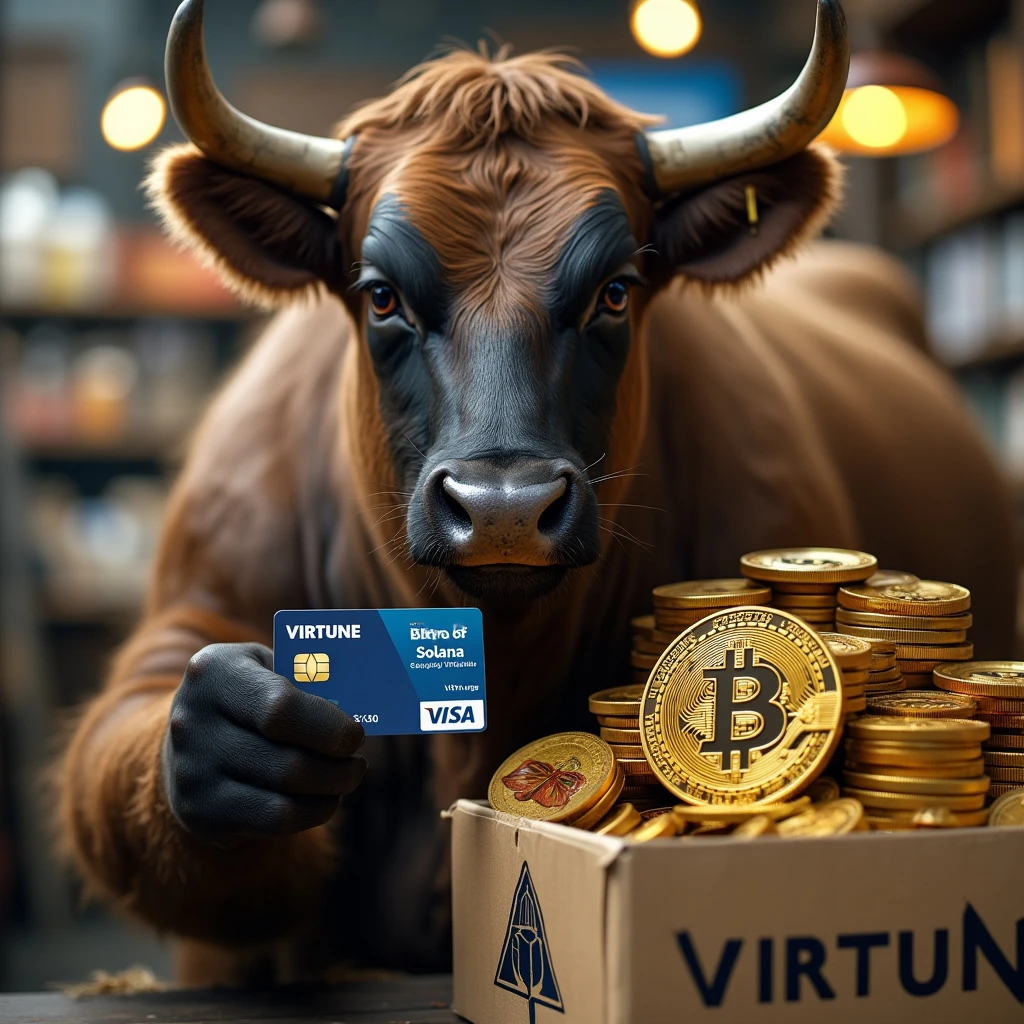 A bull is shopping for Virtune Bitcoin using his PayPal card, and the card says ‘Virtune Solana’