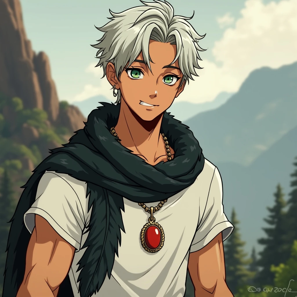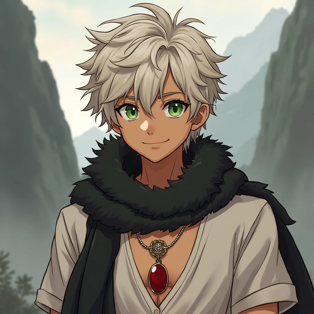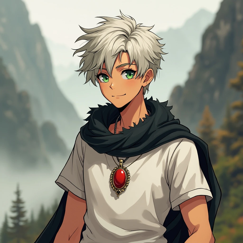 A portrait of a young male with short, tousled white hair with varying shades and highlights, giving it depth and texture. His striking emerald green eyes are accentuated by dark eyeliner and mascara, looking directly at the viewer with a confident, friendly expression and a warm, confident smile. He has light brown skin and a slightly tanned complexion. The man is wearing a crisp white short-sleeved shirt with soft folds and shadows highlighting its texture, revealing muscular definition on his arms. Around his neck is a large, fluffy black scarf made of soft feathers or fur, adding depth and texture to the image. A thin silver necklace with an intricate design holds a striking red oval pendant with a gold rustic rope-like detail, suspended near his collarbone. The background is a mist moutain in the shades of grey and brown, providing contrast to the character and emphasizing him as the focal point. The lighting is soft and even, illuminating the character's face and upper body without harsh shadows. The overall mood of the illustration is adventurous and confident, with balanced exposure and moderate contrast, creating a vibrant and lively appearance.
