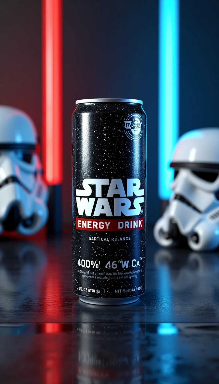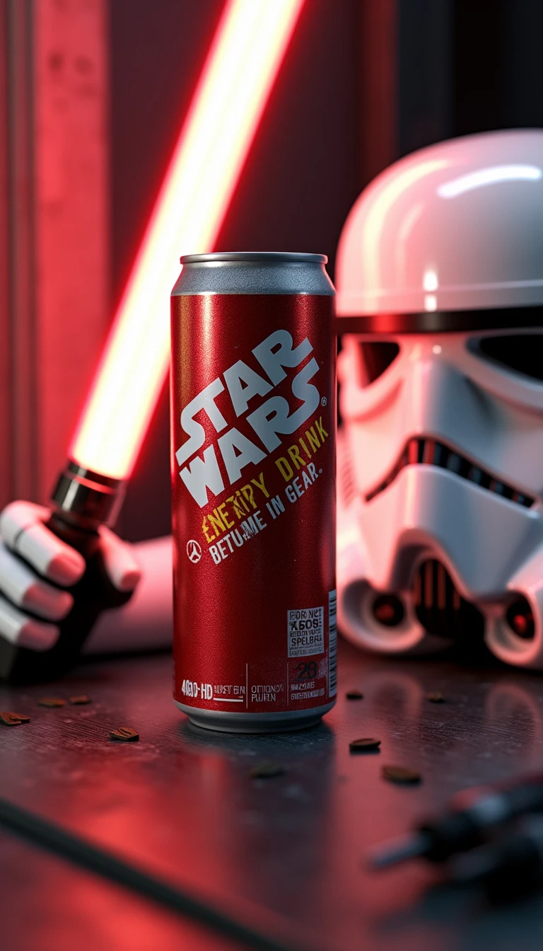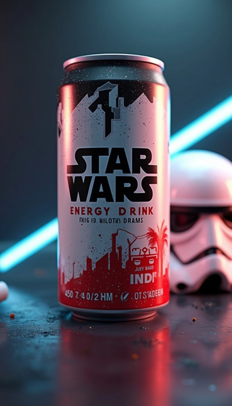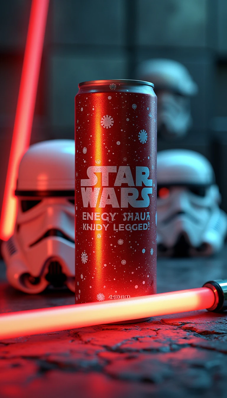 A hyper-realistic product scene featuring a Star Wars Energy Drink. The drink is accompanied by a lightsaber and a Stormtrooper helmet. The scene is rendered in 4500 HD CGI.