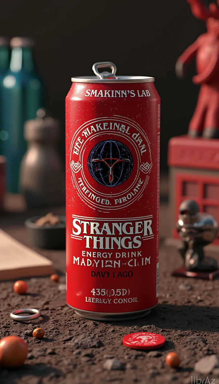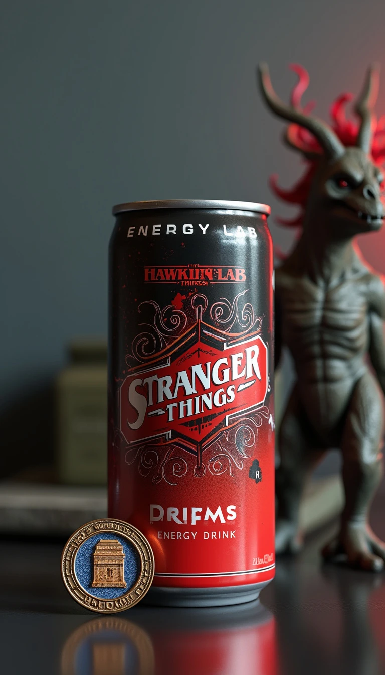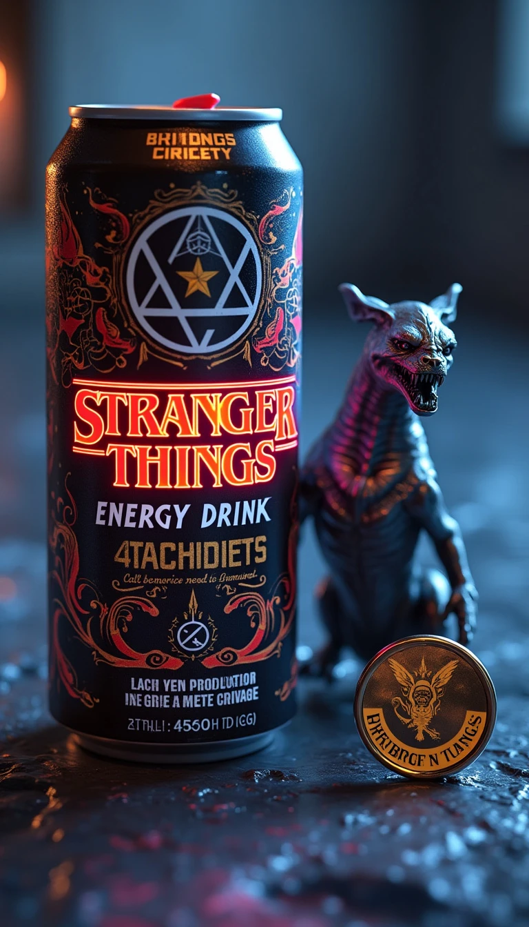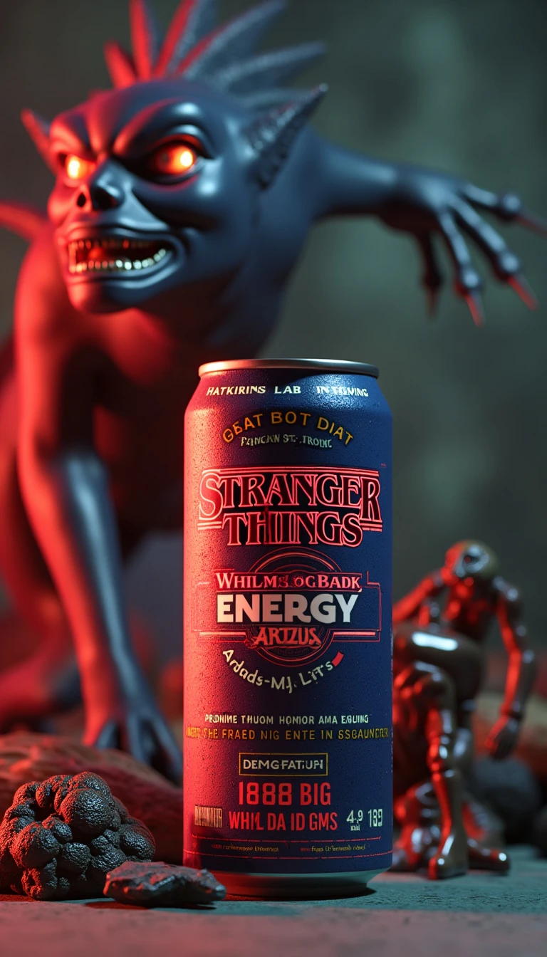 A hyper-realistic product scene featuring a Stranger Things Energy Drink. The drink is accompanied by a Hawkins Lab badge and a Demogorgon figurine. The scene is rendered in 4500 HD CGI.