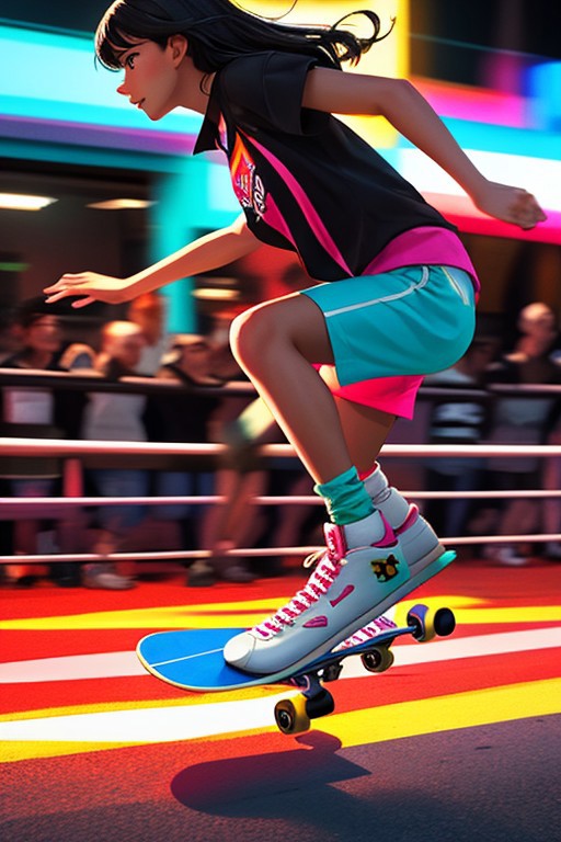 a leroynieman style painting of 1girl, A closeup of a skateboarder mid-trick in a vibrant urban skate park, the background is a blur of neon colors, with streaks of red, yellow, and blue highlighting the movement and energy, the dynamic brushstrokes emphasizing the skateras speed and skill, surrounded by a vibrant, cheering blur of the crowd.
