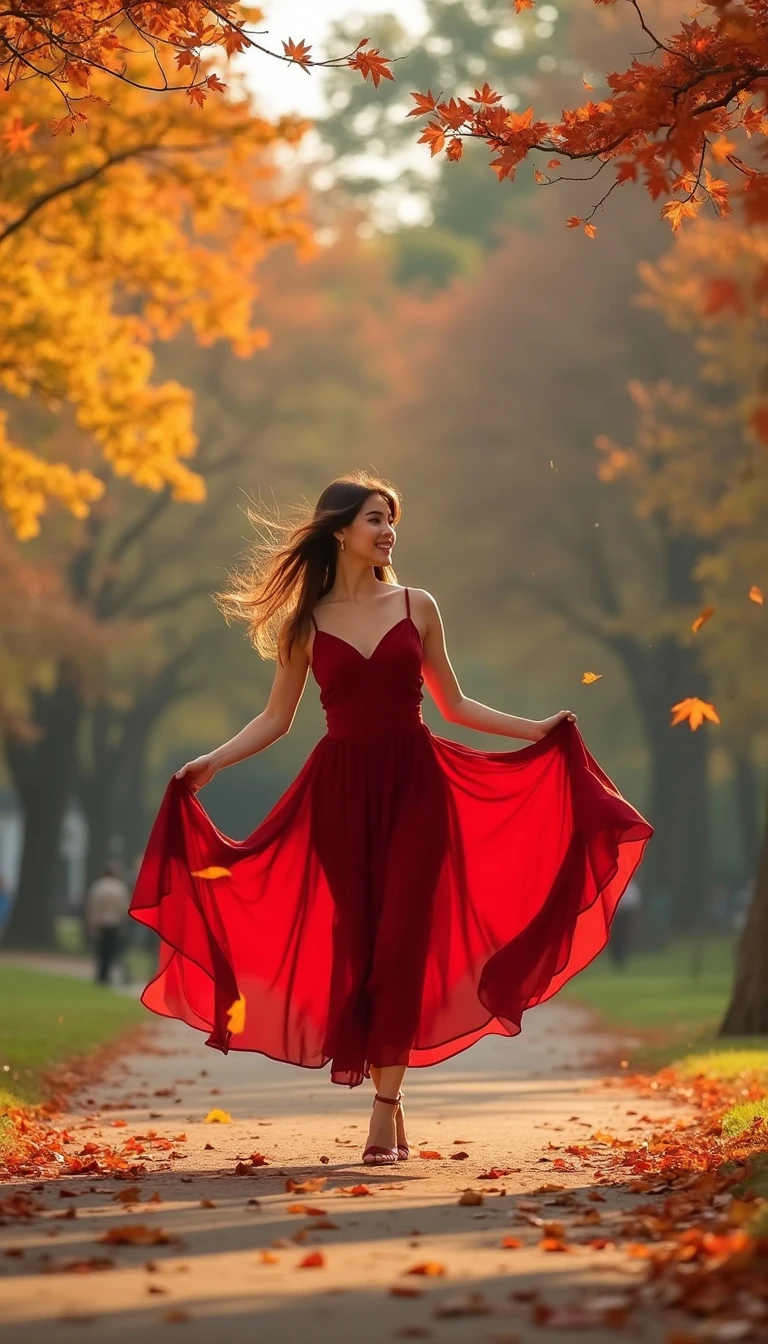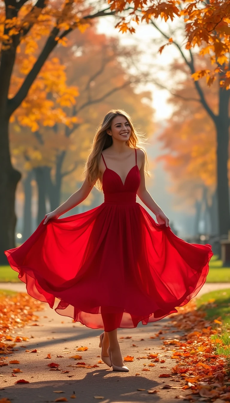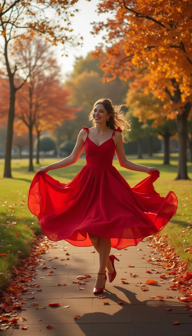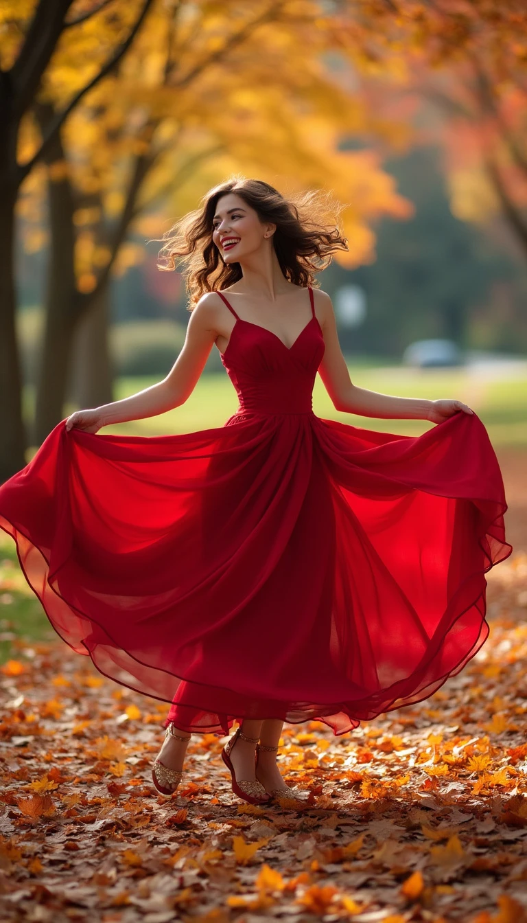 Scenario: A picturesque park in the midst of autumn, with fallen leaves scattered on the ground and trees displaying vibrant fall colors such as oranges, reds, and yellows. The sky is clear with soft, warm light typical of a late afternoon. Subject: A beautiful woman wearing a flowing red dress is spinning gracefully. She holds the edges of her dress, which flares out as she twirls. Her expression is joyful and carefree, capturing the essence of the autumn afternoon. Atmosphere: The scene is lively and serene, evoking a sense of elegance and delight. The combination of the woman's movement and the autumn setting creates a warm and inviting atmosphere. Composition: The woman is positioned centrally, with the autumnal park setting as the backdrop. The dress's flowing motion is captured dynamically, with fallen leaves around her enhancing the seasonal feel. Style: Realistic with a focus on capturing the fluidity of the dress and the beauty of the autumn setting, emphasizing the contrast between the vivid red dress and the warm autumn tones. Lighting: Soft, golden light typical of late afternoon sun, highlighting the woman's dress and creating a gentle glow on the surrounding autumn leaves. Secondary_elements: Fallen leaves on the ground, vibrant trees with autumn foliage, and a clear, softly lit sky, all contributing to the serene and joyful mood of the scene. Interaction: The woman's spinning motion interacts with the autumn leaves on the ground, adding a sense of movement and harmony to the peaceful park setting.