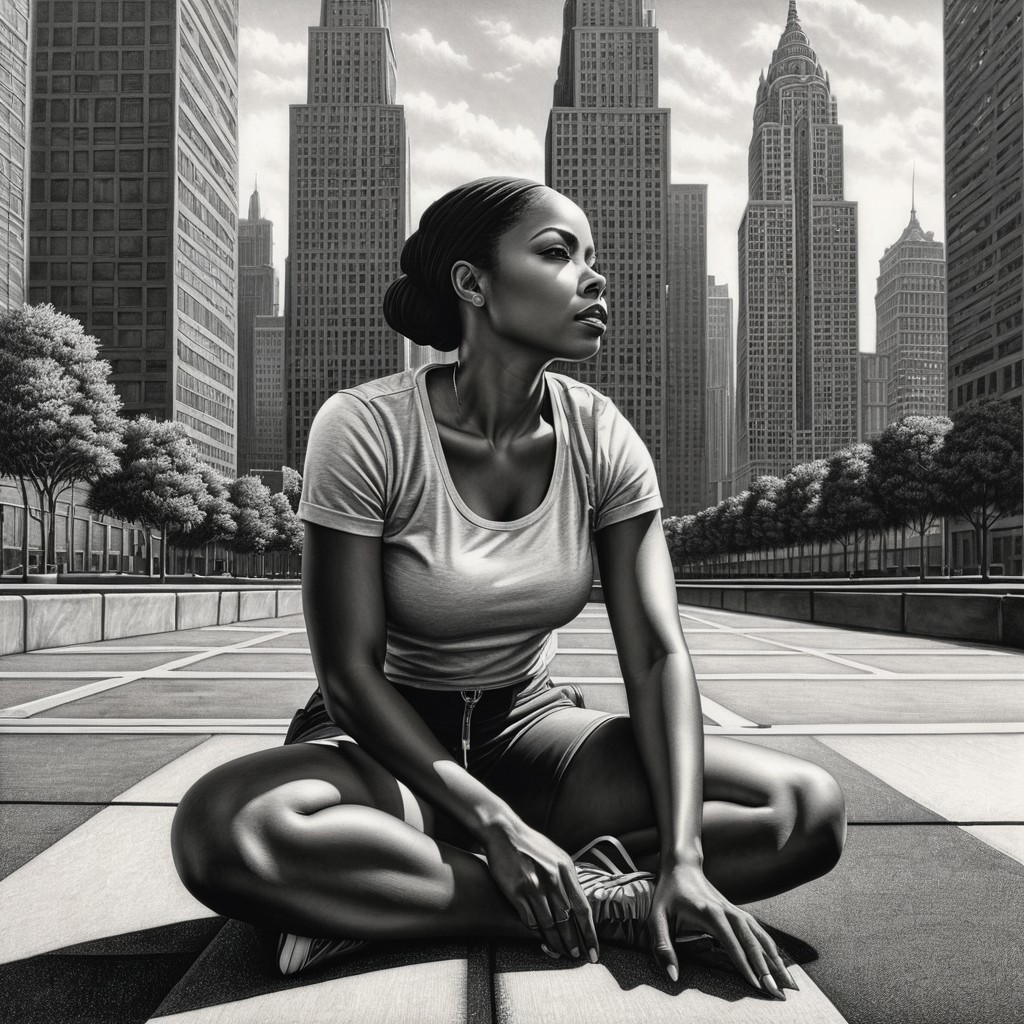 Hyper-realistic detailed pencils drawing. Close up. African American Woman sitting on the ground with legs bent, knees to chin, and arms outstretched to each side, head tilted to the side resting on knees. Medium shot. Softly rendered oblic light on her face. Dark cityscape in the background with towering skyscrapers. High contrast, detailed textures, precise lines, perfectly centered. Desolate urban atmosphere. Extremely detailed morphology, flawless proportions, reminiscent of Richard Estes. Completely realistic drawing, accurate proportions and anatomy. Photorealism.