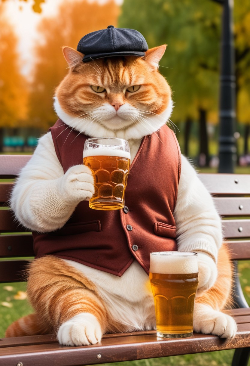 anthropomorphic Fat chubby ginger cat wearing a vest and cap sitting on park bench and drinking beer in park, holding beer bottle with paw, dynamic angle, warm hues, realistic, photorealism, hd, 8k, high definition, BREAK, score_9, score_8_up, score_7_up, score_6_up